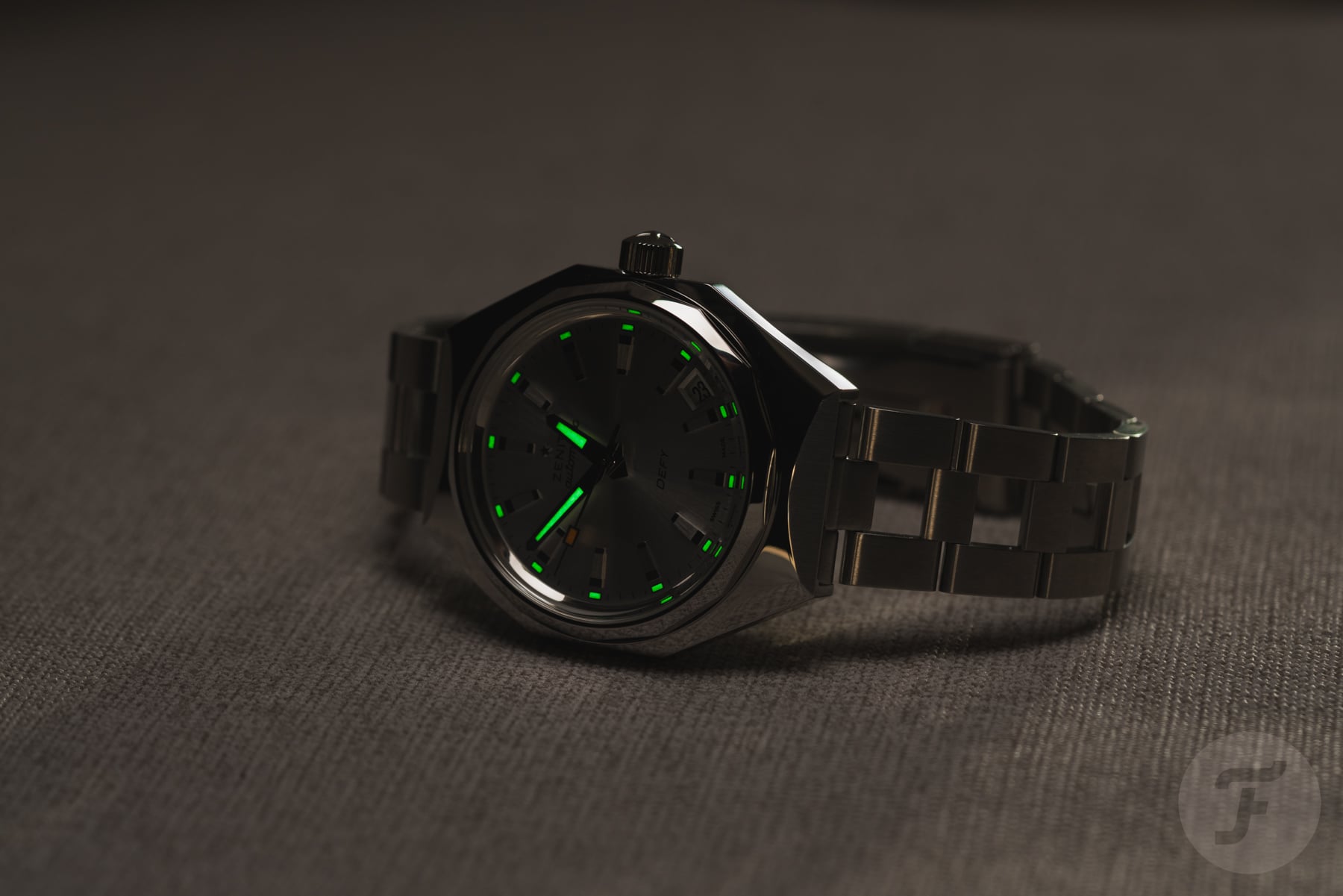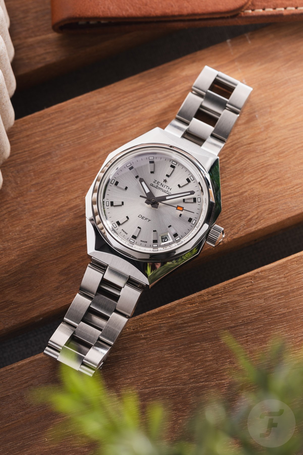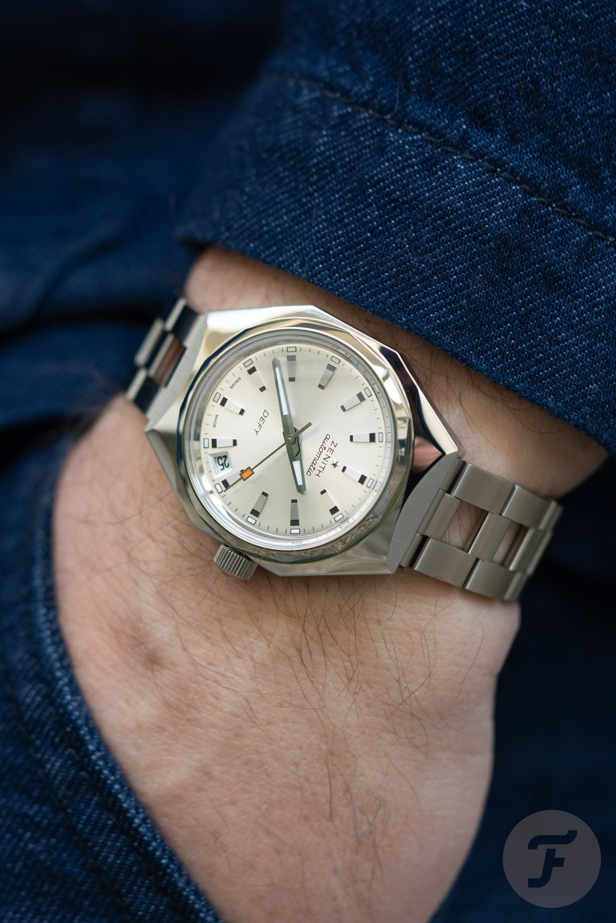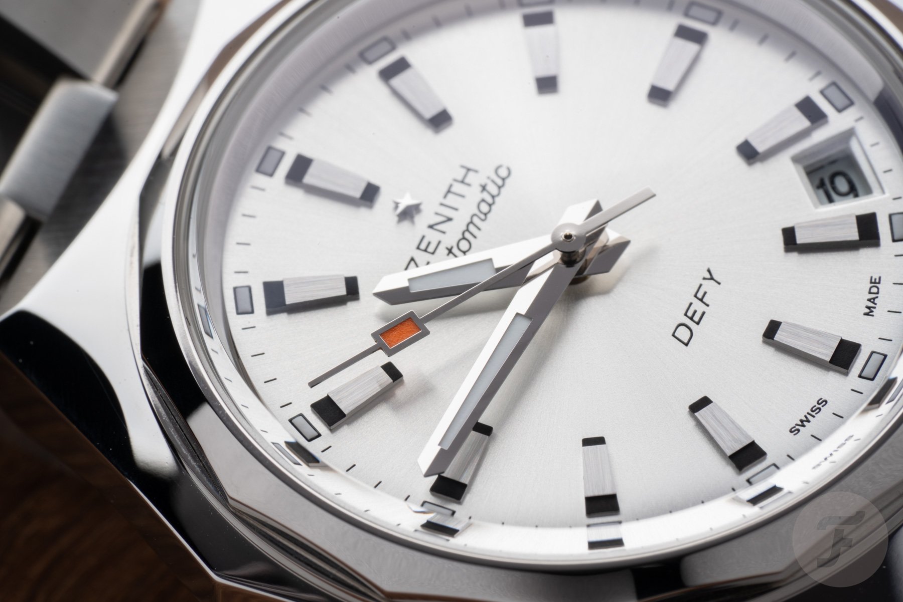 The Defy Revival A3643 features the familiar stainless steel octagonal “Miura” case with a 14-sided bezel. This nicely proportioned case has a modest 37mm diameter, 13.6mm thickness, and 44mm length. While it offers plenty of retro charm, the case design still feels relevant almost six decades later. For this model, Zenith paired with a silver-tone sunray dial featuring a full set of 12 identical hour markers. Encircling them is an open minute track, with luminous rectangles marking every hour.