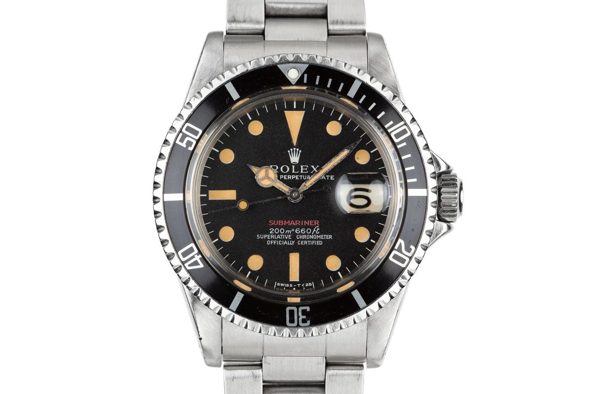 Backtracking slightly to 1969, Rolex introduced the first regular Submariner with a date. This new Submariner reference 1680 featured the chronometer-certified caliber 1570. Released 16 years after the first Submariner, it marked a turning point for the line. Though the original Submariner had been designed as a diver’s tool, it was also intended to be elegant enough to wear every day. As the date complication with Rolex’s signature Cyclops magnifier was a great everyday convenience, the addition of a date complication was likely a logical evolution. The watch featured the same overall styling as concurrent dateless Submariner references. “Submariner”, however, was written in red, leading modern-day collectors to call this model the “Red Sub.” The water resistance rating on the first three iterations of the 1680 dial also indicated meters first. This is a tiny detail that collectors go crazy for.