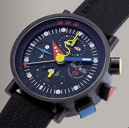 Also, the typical Alain Silberstein colors are applied to the Hm2.2, as well as the square, circel and triangle. Although it doesn’t sound very respectful, I always refer to the Sony Playstation controller that also used these icons. Alain Silberstein uses these icons to shape the pushers and crown on his own time pieces (as pictured below), while the HM2.2 carries them on the second dial of the watch.