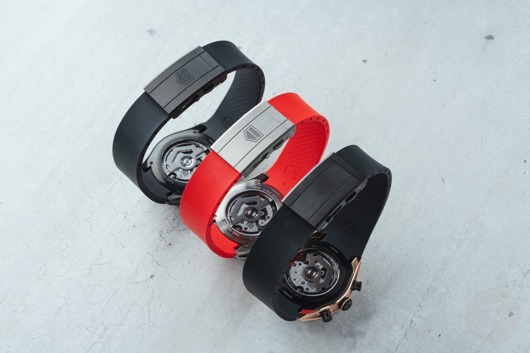 Okay, I am oversimplifying matters somewhat. Although the base of the watch is very similar, there aren’t actually that many parts shared between the normal chronograph and these new models. For starters, the steel and ceramic of the regular model make way for a titanium and ceramic combo here. The Heuer 02 movement is upgraded to the (extremely similar) TH20-00. The rubber strap is different too, lifted from the Porsche 963 limited edition.