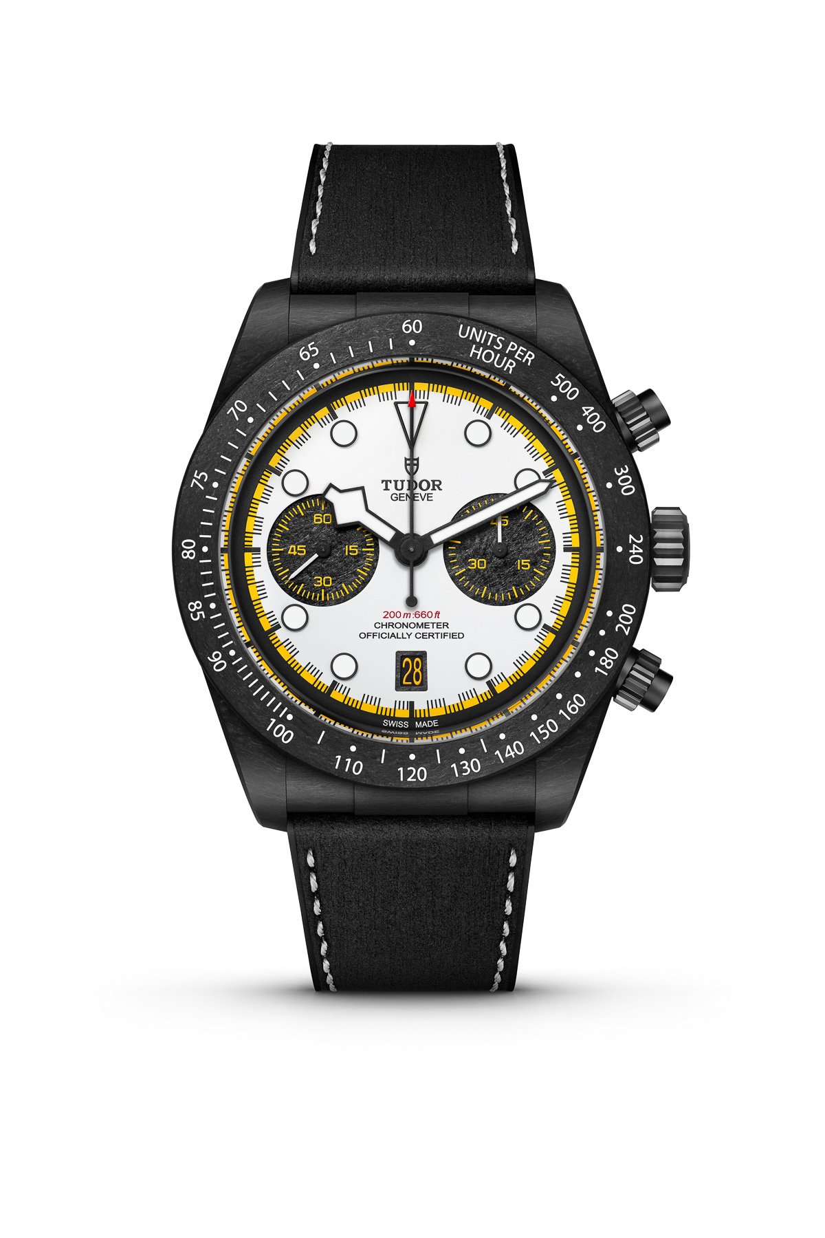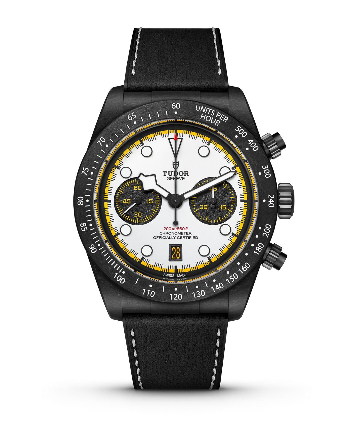 Inside is the Manufacture Chronograph Caliber MT5813. This automatic movement features a column wheel, vertical clutch, silicon balance spring, and a 70-hour power reserve. It is COSC-certified and based on a platform developed with Breitling, adapted to Tudor’s specifications. Functions include central chronograph seconds, elapsed minutes, running seconds, and date. The watch is paired with a hybrid leather-and-rubber strap featuring a tire-inspired pattern and carbon fiber end links. These make a nod to the watch’s automotive theme while helping keep overall weight relatively low.