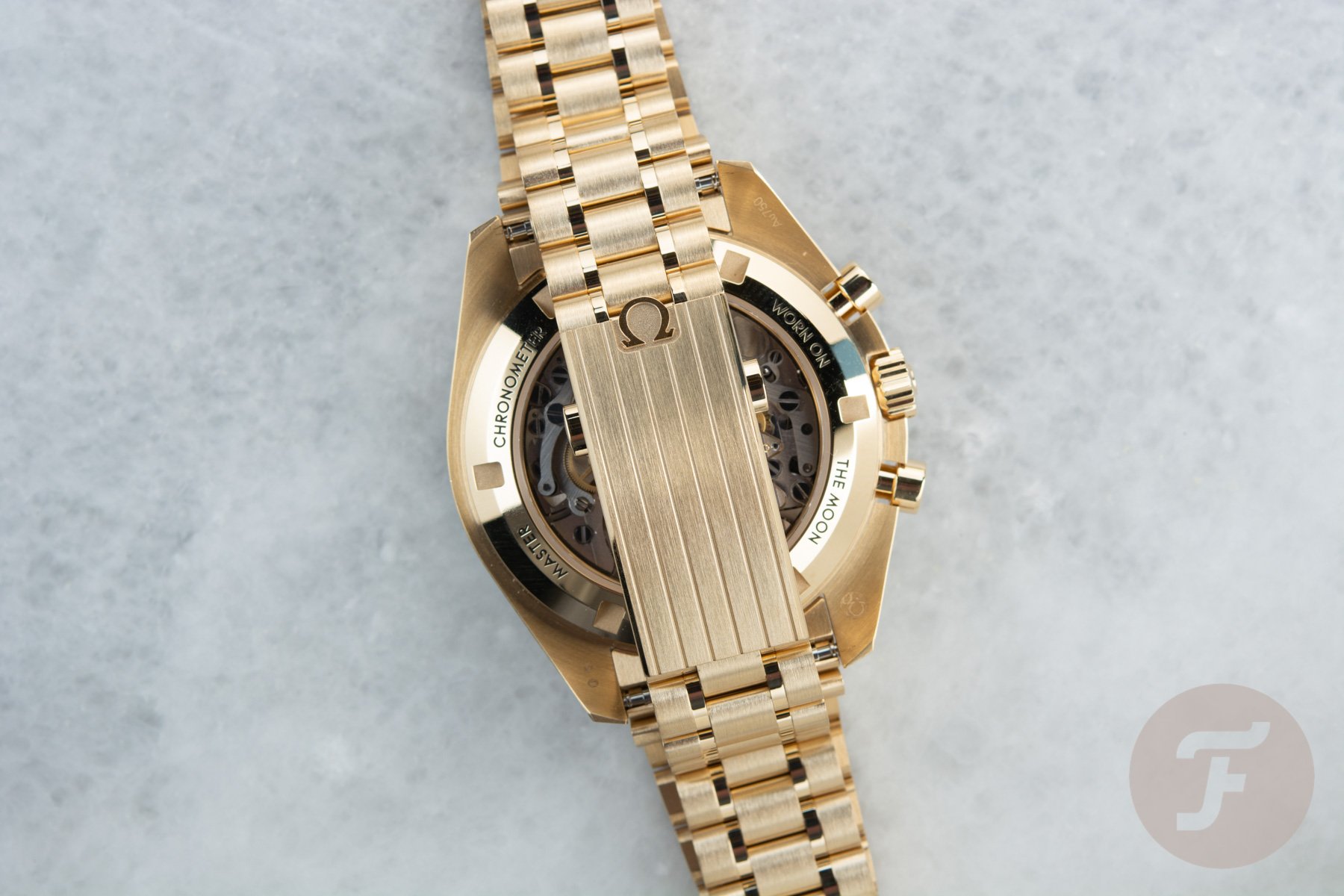 Let’s start off with the green Speedmaster Professional Moonshine Gold ref. 310.60.42.50.10.001. As it is the current Speedmaster Professional, most of you will be familiar with its specs. But let’s remind ourselves quickly. The watch comes with a 42mm Moonshine Gold case that is 13.18mm high and has a lug-to-lug 47mm. The case is the same as used for the other models in the collection. The watch comes with the same gold bracelet that is used for the other Moonwatch models. It tapers down from 20mm at the lugs to 15mm at the clasp. The clasp comes equipped with a comfort release adjustment (extension) that adds 2.3mm. Some of you might have spotted there is a slight difference in the execution of the bracelet compared to the other gold models. The bracelet of this Moonshine version features polished inlays that add a bit of extra flair to the overall looks.