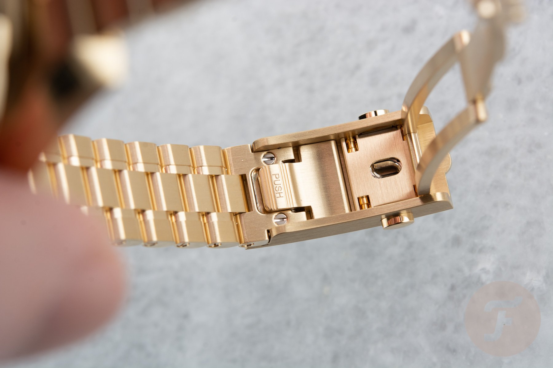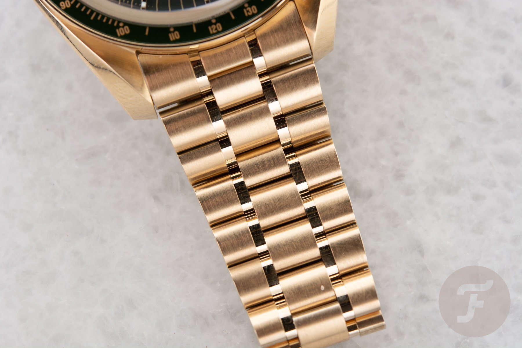 Let’s start off with the green Speedmaster Professional Moonshine Gold ref. 310.60.42.50.10.001. As it is the current Speedmaster Professional, most of you will be familiar with its specs. But let’s remind ourselves quickly. The watch comes with a 42mm Moonshine Gold case that is 13.18mm high and has a lug-to-lug 47mm. The case is the same as used for the other models in the collection. The watch comes with the same gold bracelet that is used for the other Moonwatch models. It tapers down from 20mm at the lugs to 15mm at the clasp. The clasp comes equipped with a comfort release adjustment (extension) that adds 2.3mm. Some of you might have spotted there is a slight difference in the execution of the bracelet compared to the other gold models. The bracelet of this Moonshine version features polished inlays that add a bit of extra flair to the overall looks.