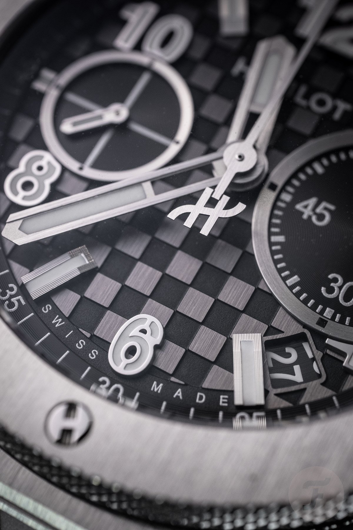 Just like last year’s anniversary models, these feature checkered dials. Hublot took inspiration from woven carbon fiber, and we see it on several models today. The dials also display alternating numerals and baton indexes, and the sub-dials cut through the adjacent numerals, which suits the industrial, technical aesthetic. Hublot provides a subtle date aperture at 4:30. Since these are solid dials, the aforementioned open view of the column wheel does not apply to these watches.
