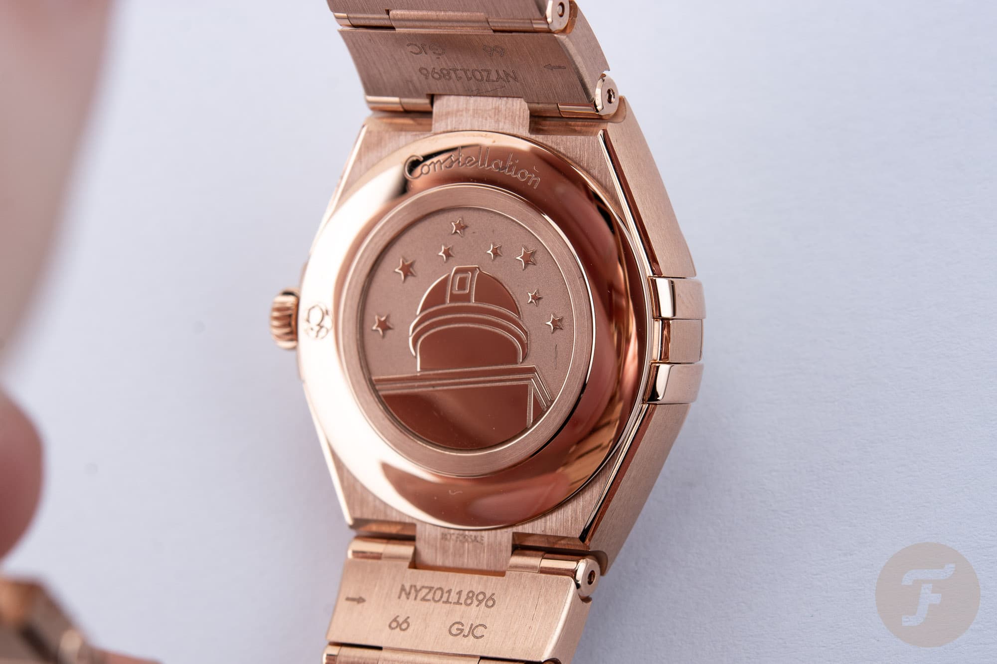 When it comes to the other two sizes of Constellation Manhattan – 28mm and 25mm – they are powered by Omega 4061 quartz movement which fits perfectly inside a small case and also makes the watch lighter to wear. What’s quite interesting about the caliber 4061 movement is that Omega Constellation Manhattan jewellery models have it at their hearts. Probably this is related to the quantities of the diamonds and gemstones used to make one masterpiece (192 brilliant-cut diamonds, four Constellation “star cut” diamonds and 12 gemstones) as with Omega Trésor. All quartz movement watches have the classic observatory medallion on the case back.