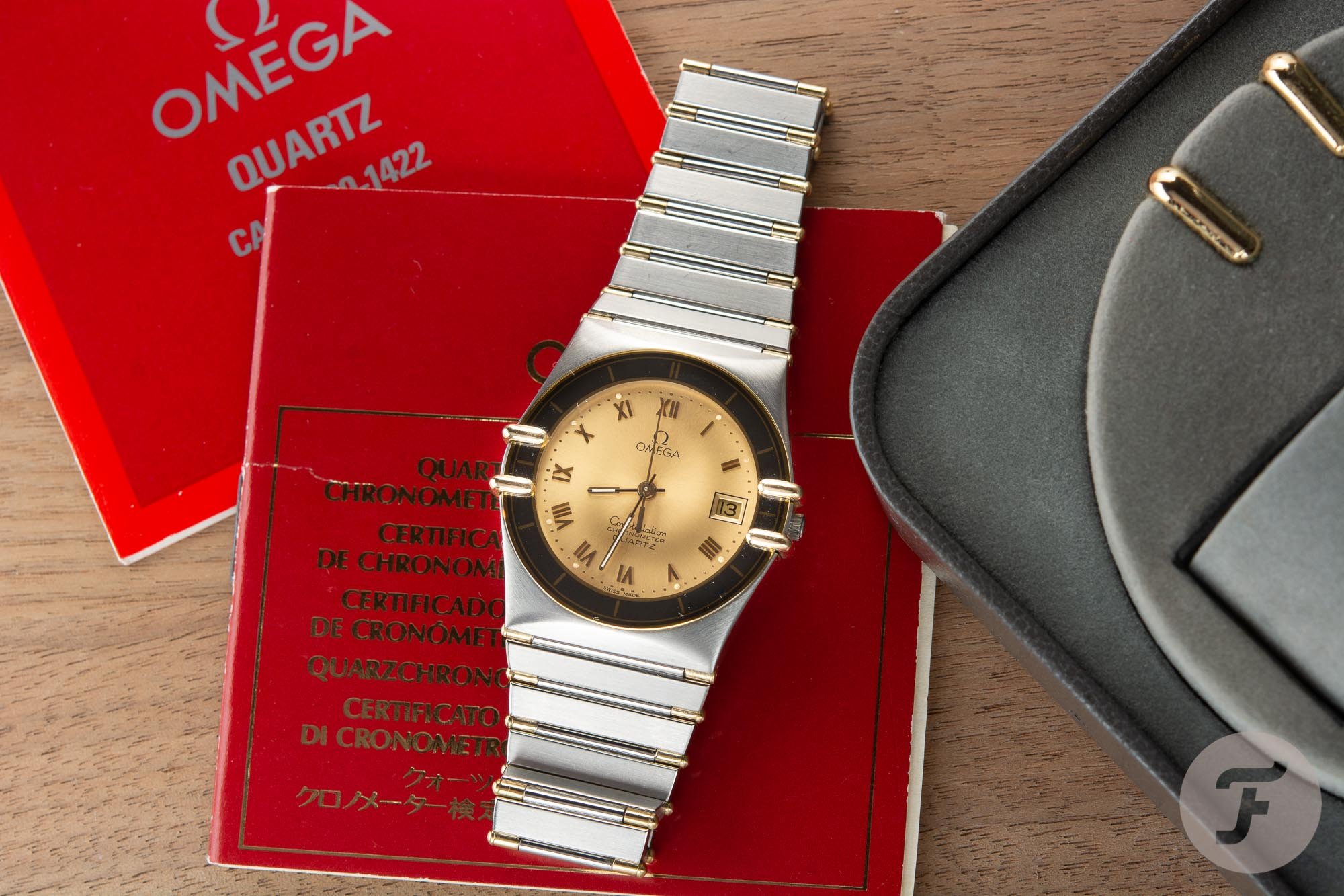 The first Constellation was launched in 1952. The collection with a round case, diamond shaped hour markers, the iconic observatory on the case back, and a distinctive leather strap, or gold woven bracelets, quickly became iconic and highly popular among Omega clientele. The first collection was stylish and versatile. The 35mm model was powered by Omega’s caliber 352 and was entirely dedicated to men. After years and years of different shapes, highly decorated dials, bracelets, and new movements, the watch was entirely reinvented in 1982 – back then Omega introduced Constellation Manhattan on the iconic integrated bracelet that presently is well-known. Below, the gents version (32.5mm!) of the Omega Constellation Manhattan with its original box (with claws).