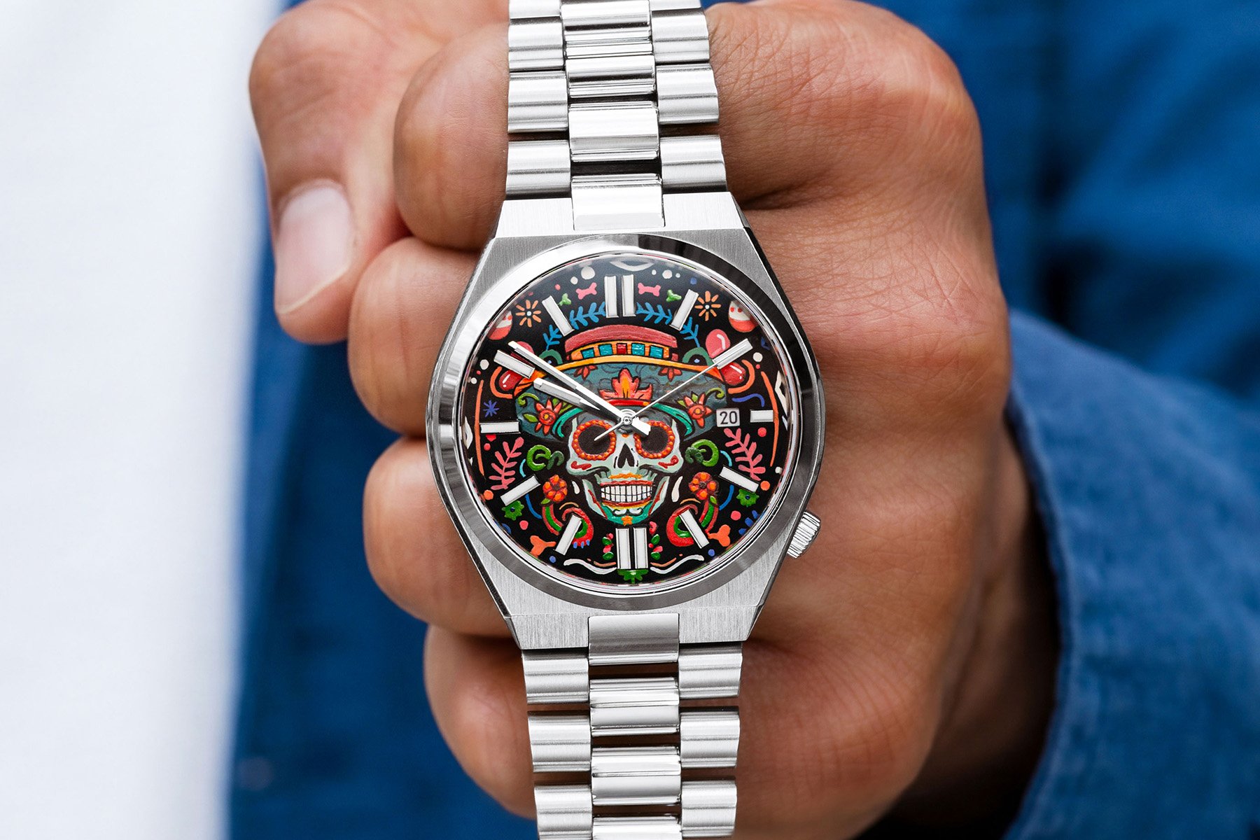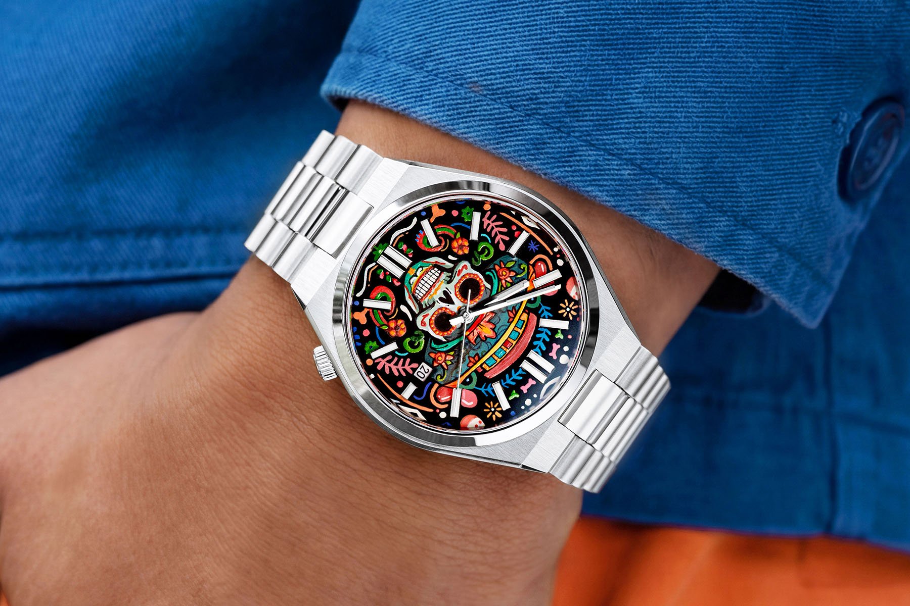 The first is the Calavera Nocturna, based on the black-dial 40mm Citizen Tsuyosa. Adorning the black backdrop is an ornate sugar skull wearing a red and green sombrero. Colorful maracas, bones, butterflies, ornamental swirls, and flowers surround the skull, creating a lively, loud, and playful dial.