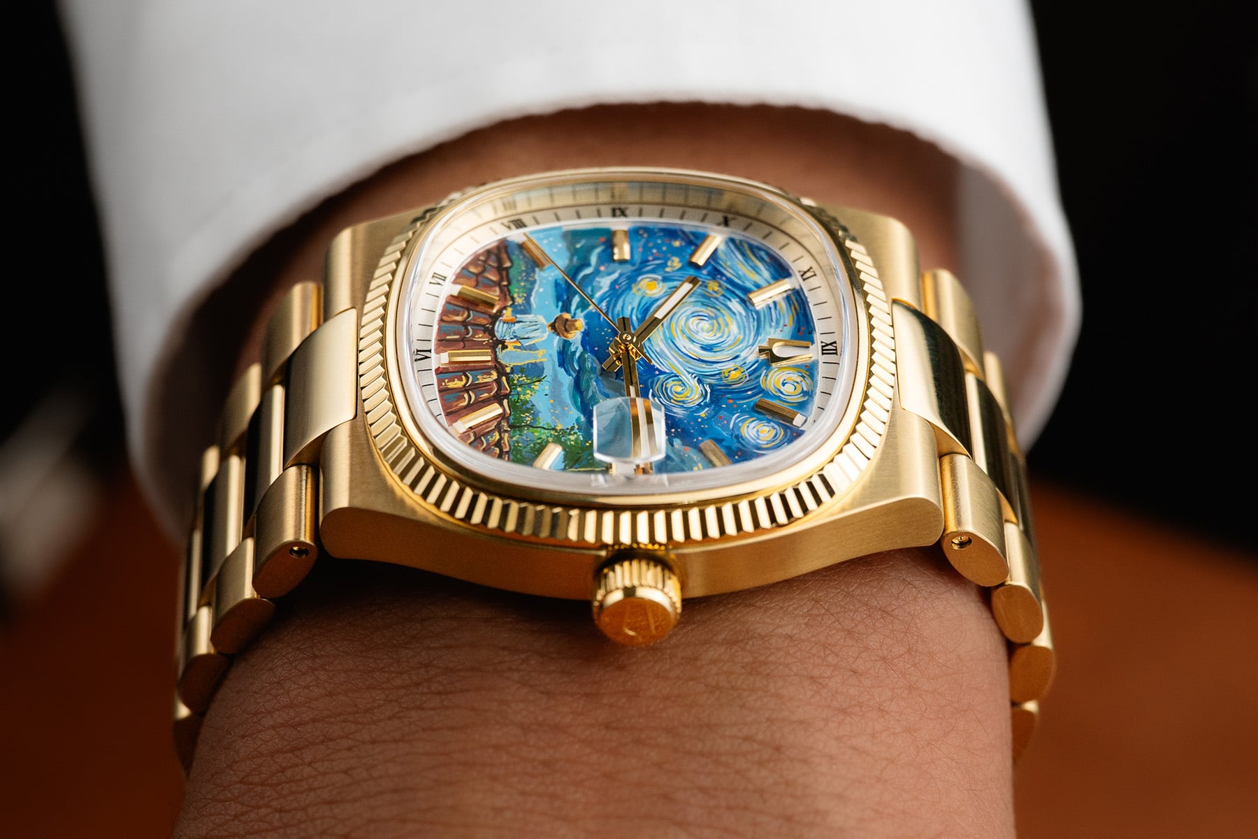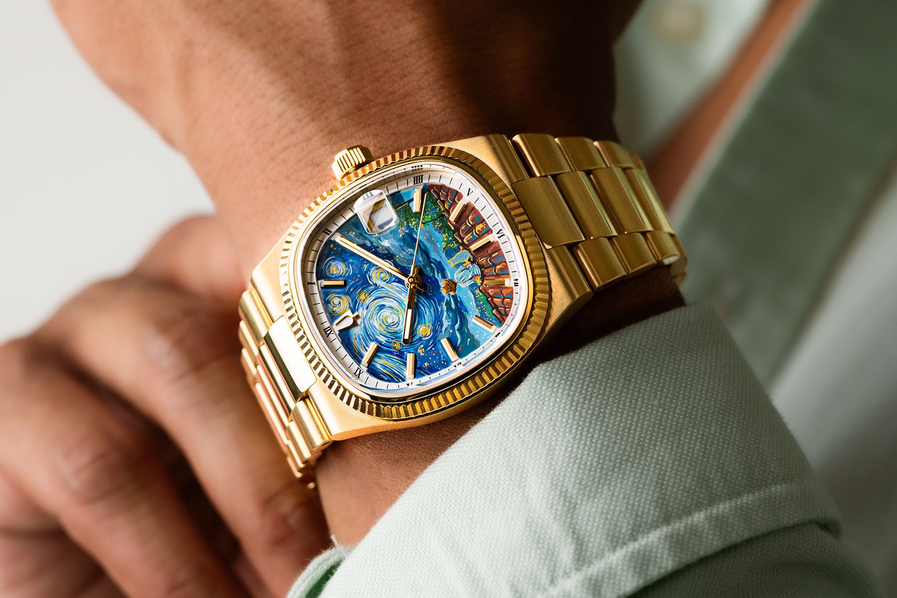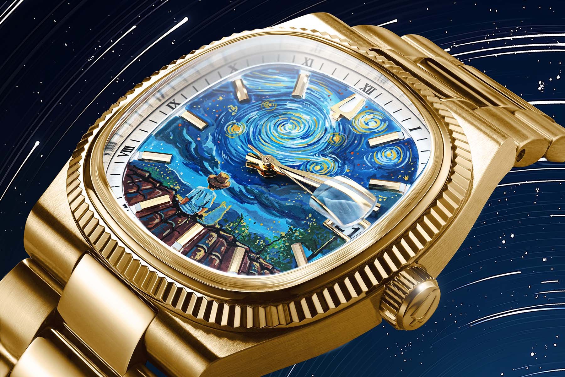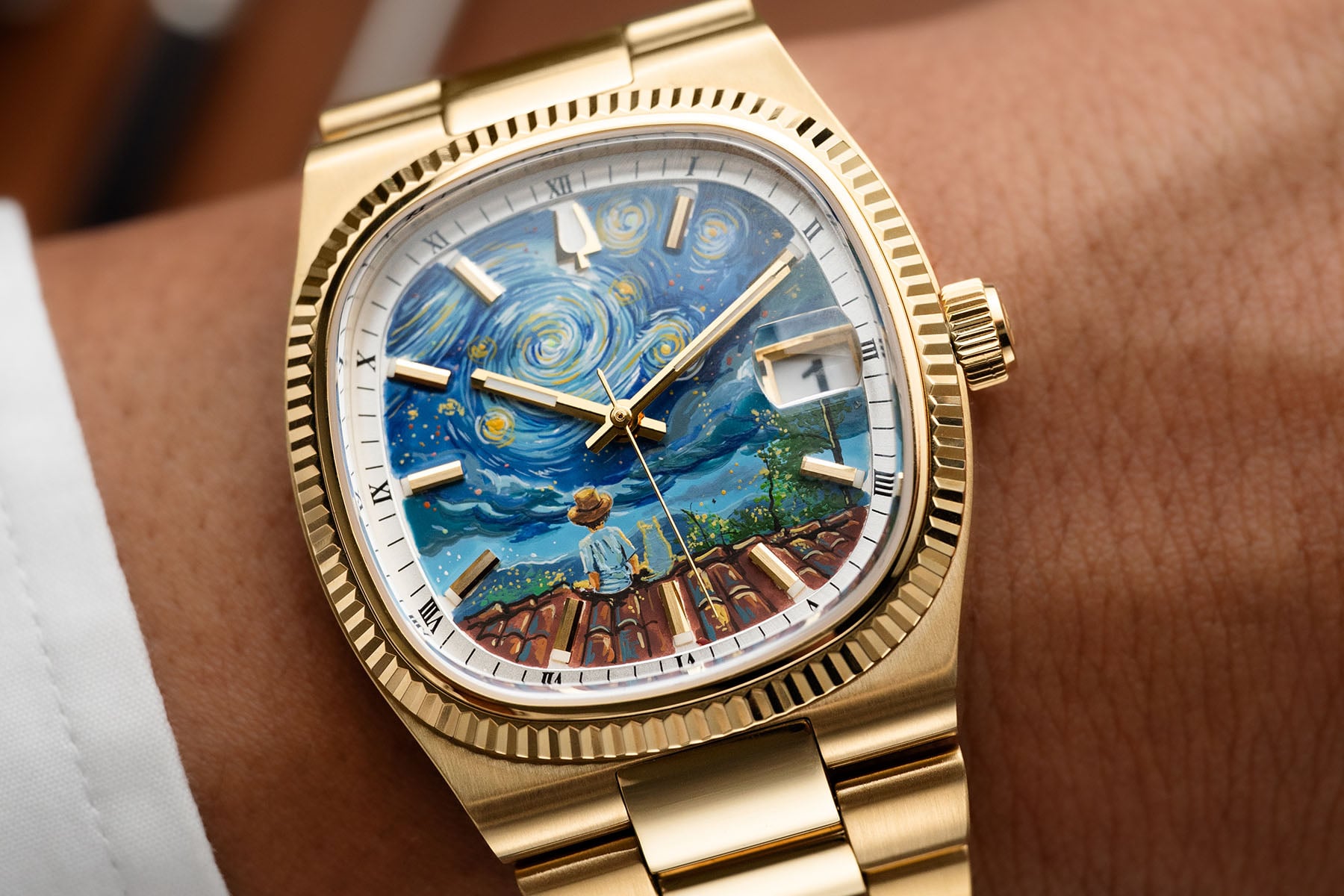 As you can see, the dial is the brand’s interpretation of the famous painting and uses the same technique for the sky. However, the overall artwork depicts a different scene of a small boy sitting on a rooftop with a cat beside him. Both of them are mesmerized by the beautiful sky above them, which is full of movement and color.