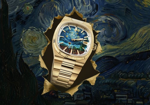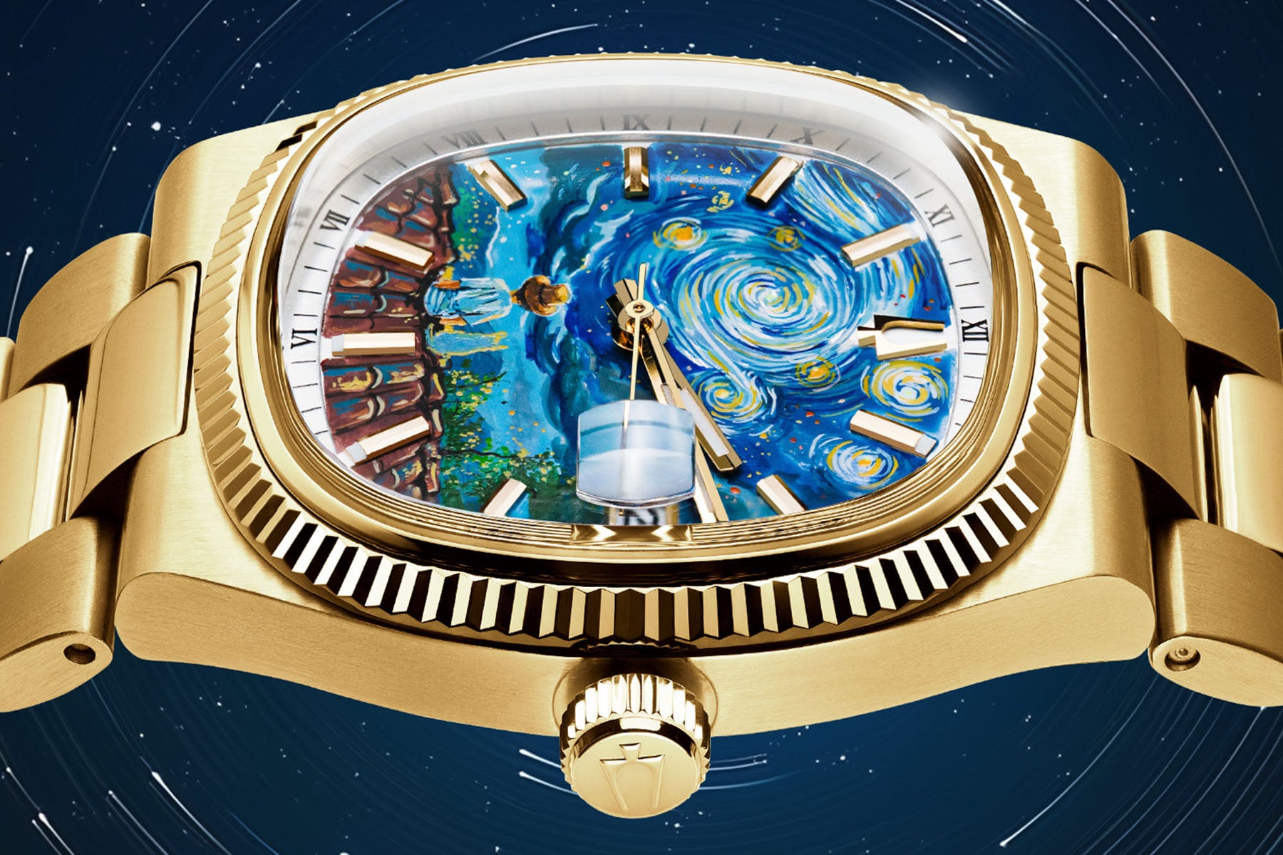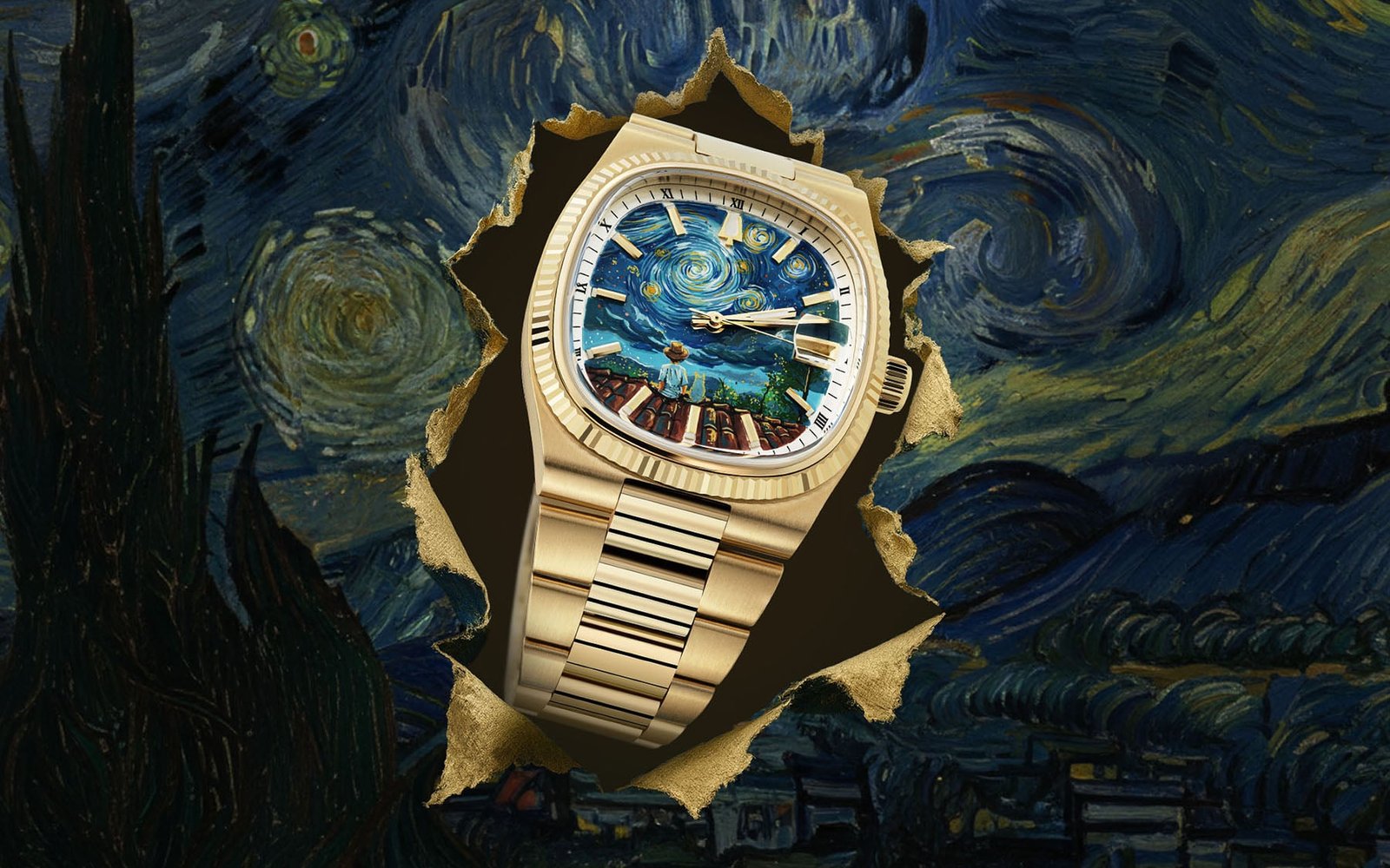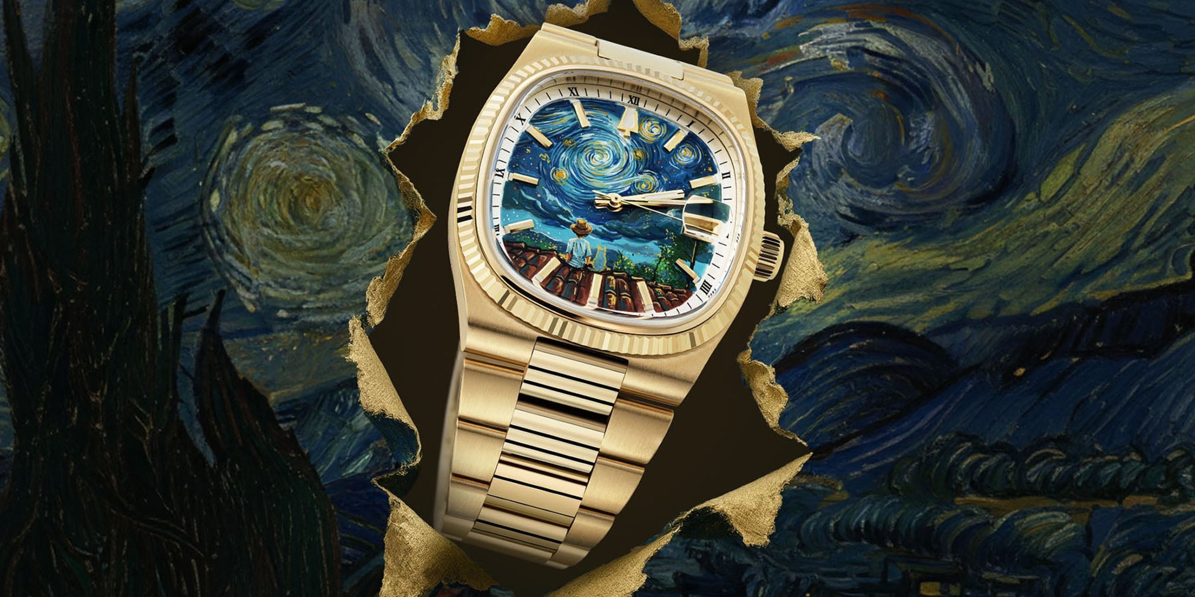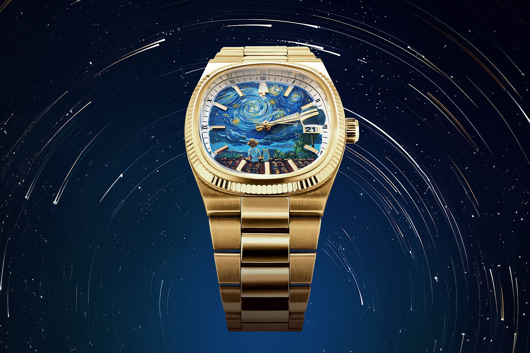 As you can see, the dial is the brand’s interpretation of the famous painting and uses the same technique for the sky. However, the overall artwork depicts a different scene of a small boy sitting on a rooftop with a cat beside him. Both of them are mesmerized by the beautiful sky above them, which is full of movement and color.