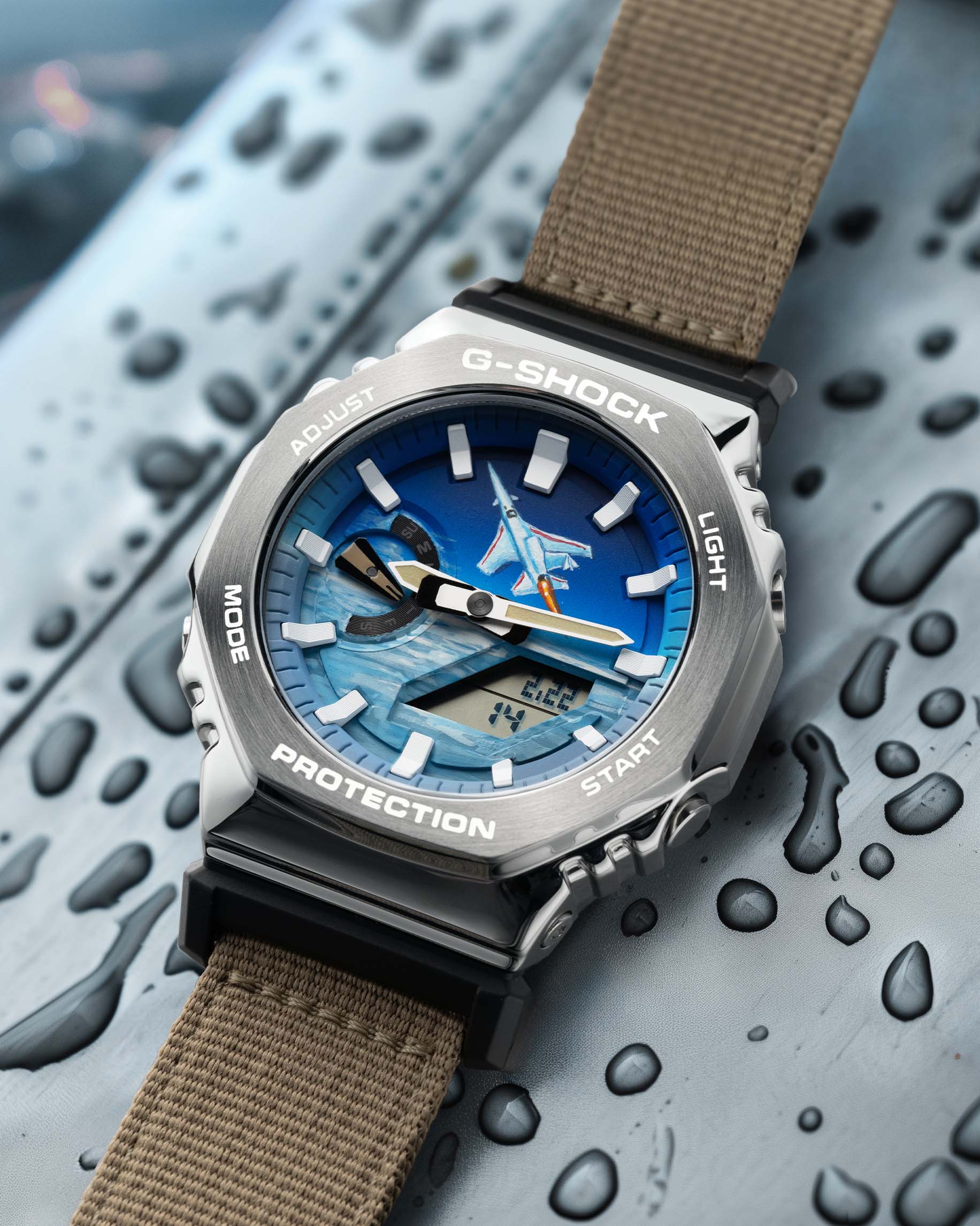The second of two models is the G-Shock CasiOak Supersonic. As the name already implies, it celebrates the modern days of aviation. The canvas for this piece is the G-Shock GM-2100C-5A. It’s slightly different from the first model as an unplated bezel and a cream-colored lume (the first model has a light green lume). Additionally, the watch comes fitted with a sand-colored fabric strap. Just like on the first model, the first step is making the bezel’s engravings white, while the second step is making the hour markers white. And similar to the first model, in the third step, the dial is customized.