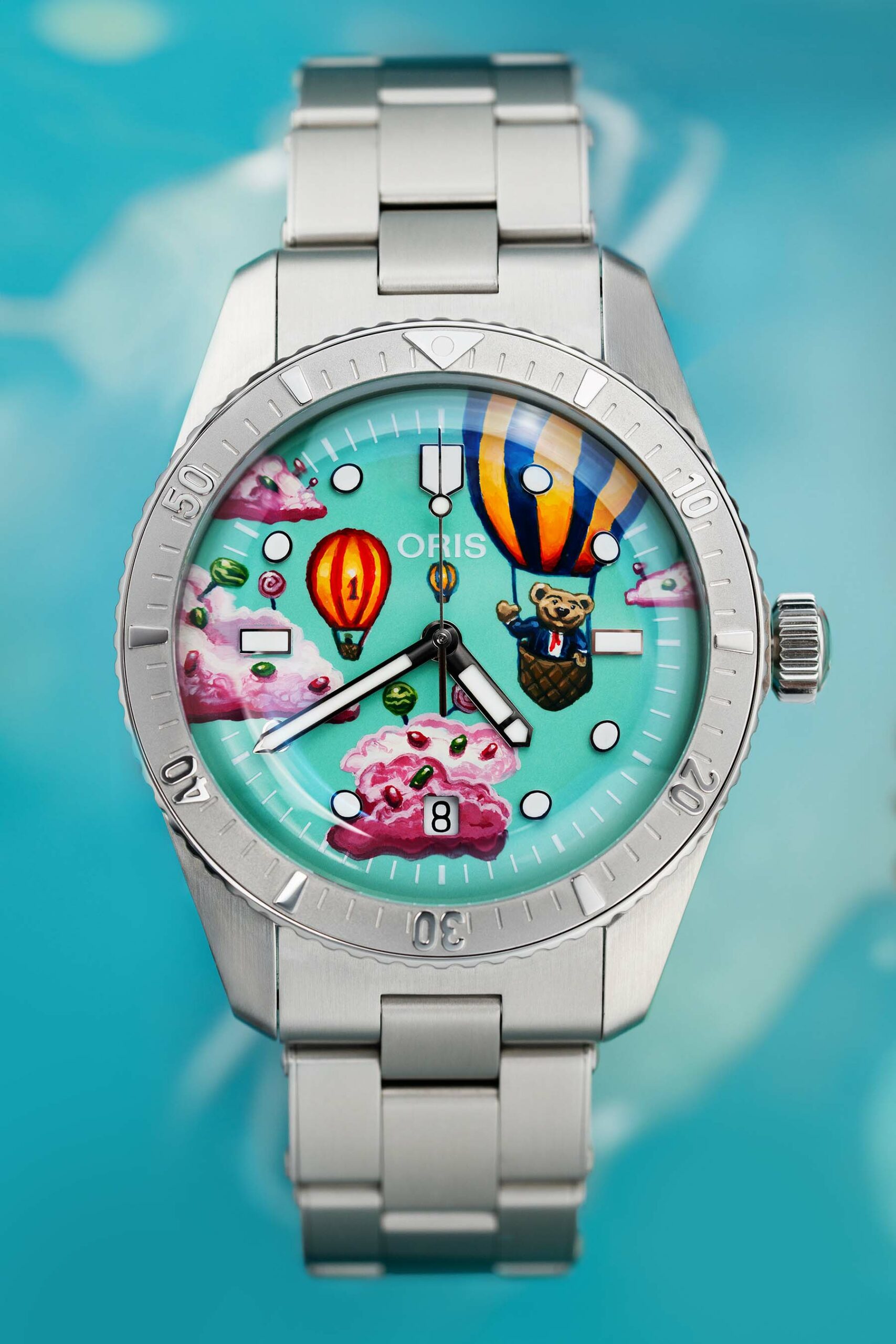 For the dial of the Aeroman, the artists at IFLW put the Oris bear in a blue and yellow balloon. Another red and yellow balloon accompanies it, both of them floating through the air filled with candy clouds. As a result, the dial is fun to see. From a distance, it only communicates the bright colors. But as soon as you get closer, all the details reveal themselves.