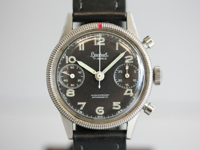 The Hanhart Cal. 42, a ratchet wheel calibre with flyback function and manual wind, was introduced in the 50s and was an evolution of the Cal. 40 and 41. The design of the hands and numerals of the Pioneer One are based on this iconic model. The caliber was installed in the Hanhart Chronograph 417 and 417 ES (the stainless-steel version), which were originally produced for the Air Force of the German Federal Armed Forces. For this reason, the clock is also called “Bundeswehr chronograph” among connoisseurs. About 500 pieces made of brass and 500 pieces made of stainless steel were produced in the 1950s. They are a rarity today and therefore extremely hard to find and get. Hanhart pilot chronographs were often an aesthetic model for the design of numerous military and aviator watches by many renowned watch manufacturers.