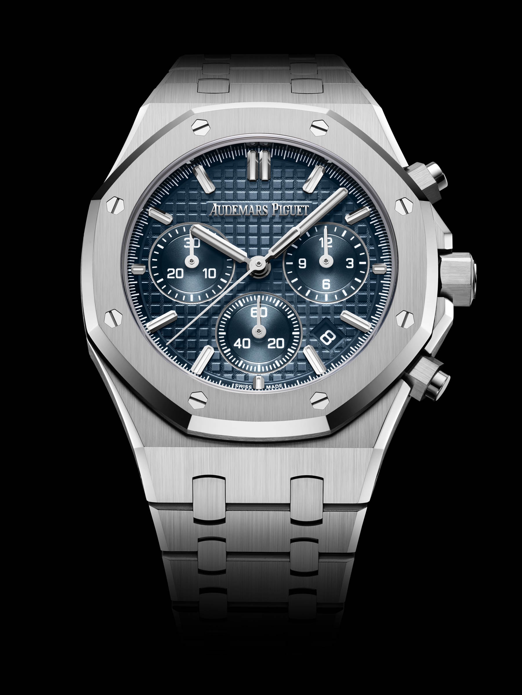 Audemars Piguet launches its new caliber 6401 in three versions of the 38mm Royal Oak Selfwinding Chronograph. The first option is the stainless steel one with a blue Grande Tapisserie dial. Then, there are two models in 18K rose gold. One has a dark gray Grande Tapisserie dial and ivory sub-dials. The other also has ivory sub-dials, but the Grande Tapisserie main dial is sand gold. That last version also features a bezel set with 40 brilliant-cut diamonds weighing 0.92 carats. The next step is to also equip the Royal Oak Offshore with this new automatic chronograph movement.