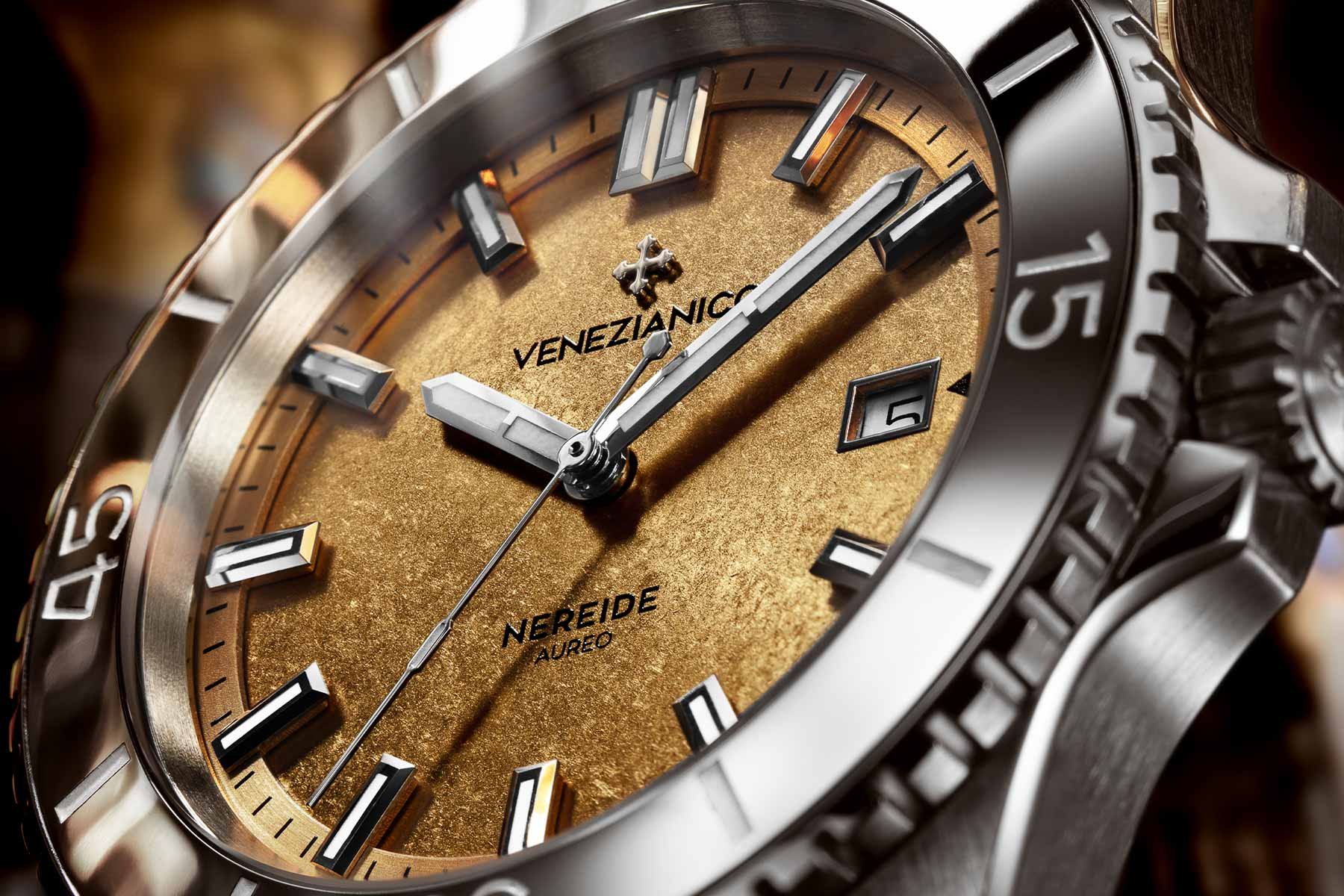 The Nereide Aureo is most noticeable because of its golden dial. Look closely, though, and you’ll see the spangled treatment on its surface. Venezianico explains that it has created these dials in the spirit of laminated metals that often adorn churches, such as the San Marco Basilica in Venice. Here, the dials are tumbled to create surface imperfections and then placed in an electrolytic bath where 24K gold is applied to the surface. Then, several layers of varnish are used to protect the dial.