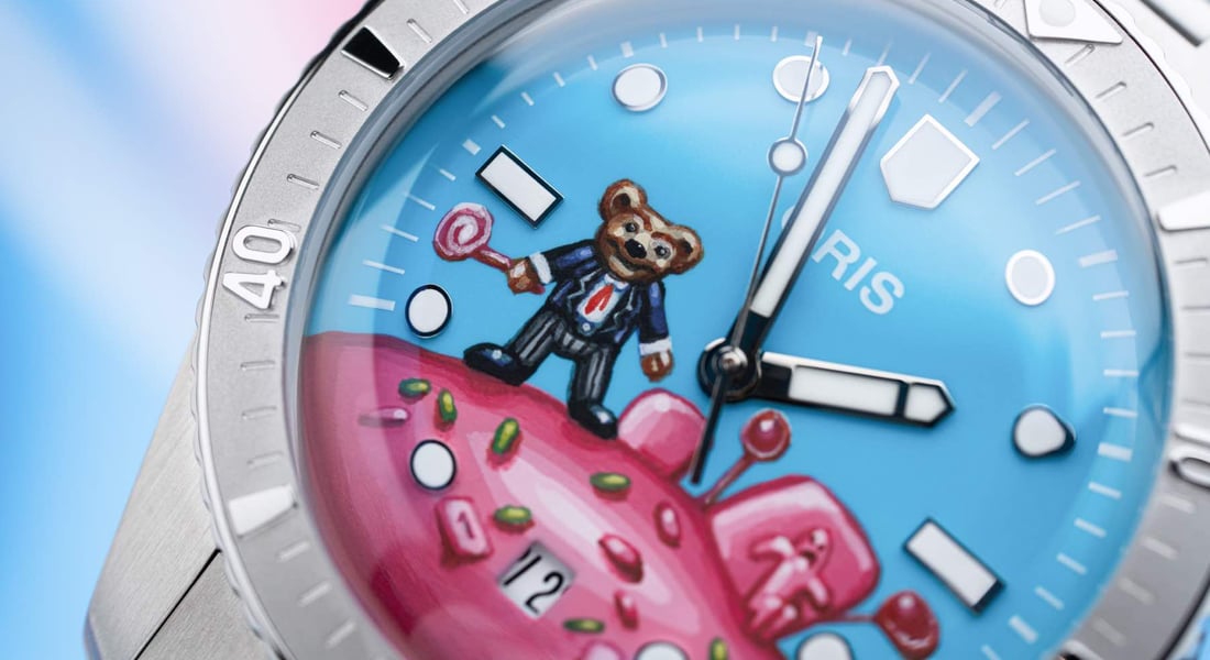 But all of that plays second fiddle to the star of the show here — the dial. IFLW has taken the dial from the Cotton Candy and handed it to one of the team’s artists. And this person is not simply any artist but a hand-enameler. The result is the mascot Oris bear placed in a bright pink candy world, sprinkling candy.