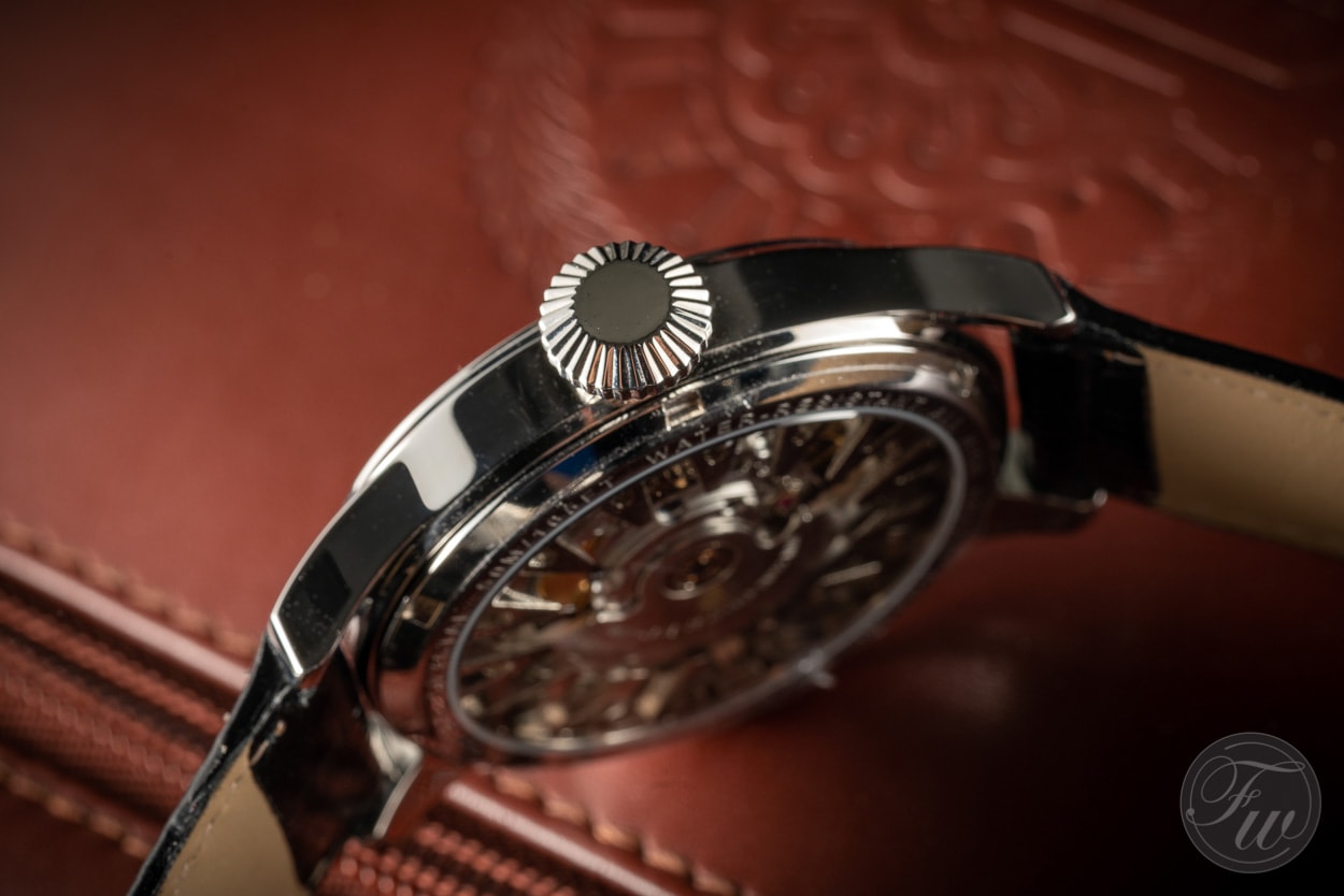 Time to have a closer look at the Diadem Silver edition. At first sight, you simply can’t miss the big crown and the dial which are eye-catching features on the wrist. While wearing the watch on the wrist the crown wasn’t uncomfortable which you could possibly expect due to its size and the case which is still rather slim. Size for the case is 44 mm which is made from stainless steel that is polished to a mirror-like finish. Also reflecting light is the dial which has various finishes both in shape and colour. Although it has the look of a guilloché dial it is produced in a different way. With a date at 6 o’clock, it’s a well-balanced design.