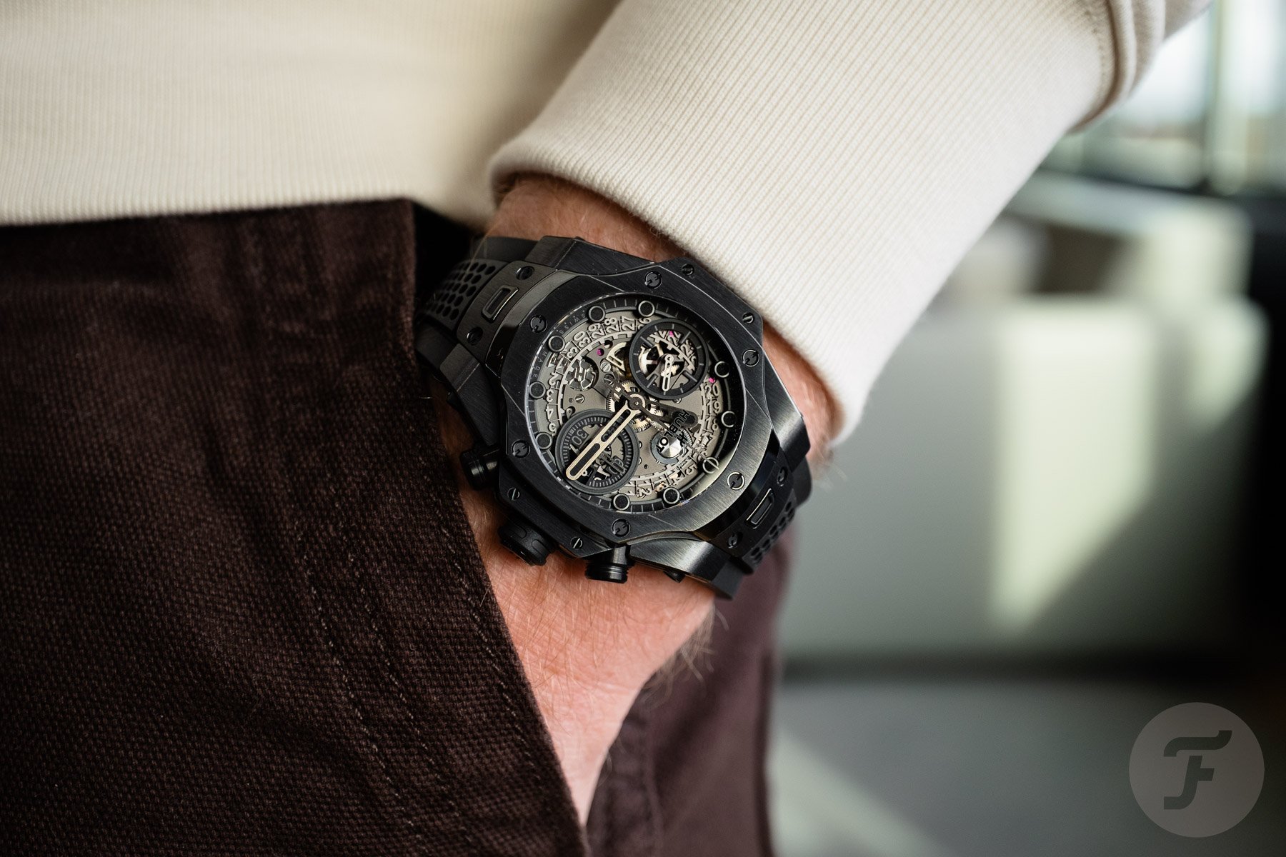 Inside ticks the Unico manufacture caliber HUB1280. This movement runs at 28,800 vibrations per hour and offers 72 hours of autonomy on a full wind. The chronograph offers flyback functionality, and the open-worked dial reveals the inner workings, including the column wheel at 6 o’clock.