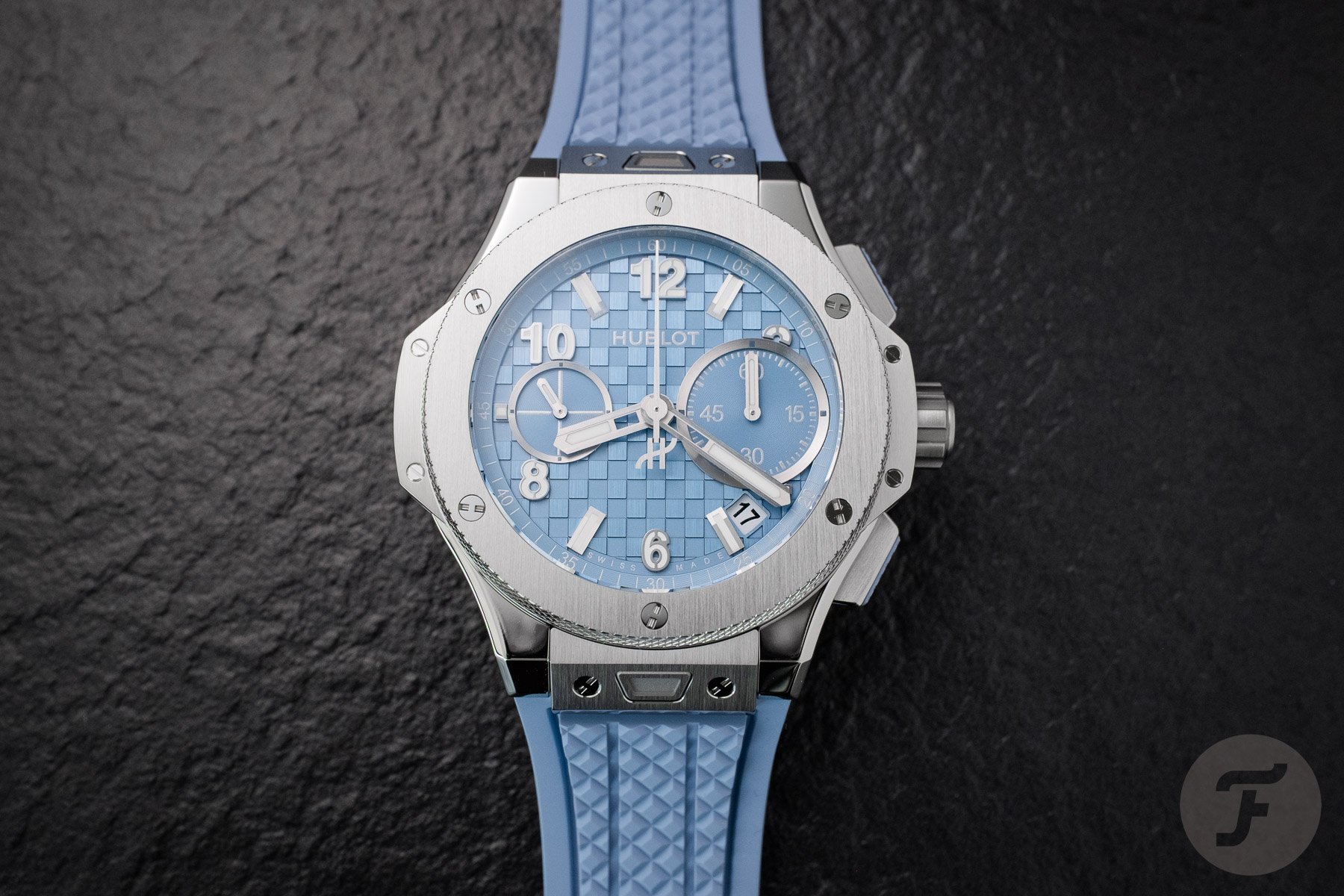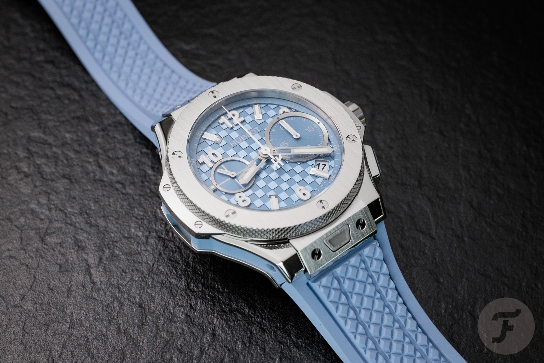 The blue fascinates me, as it breaks with Hublot tradition. The aggressive styling of the Hublot Big Bang gets juxtaposed with this soft, almost pastel color. The strict checkered pattern somehow clashes with the soft color in a positive and interesting way. This model costs €19,300 and is not limited in production. A small (33mm) version in steel with a diamond-set bezel is also available for €14,700.