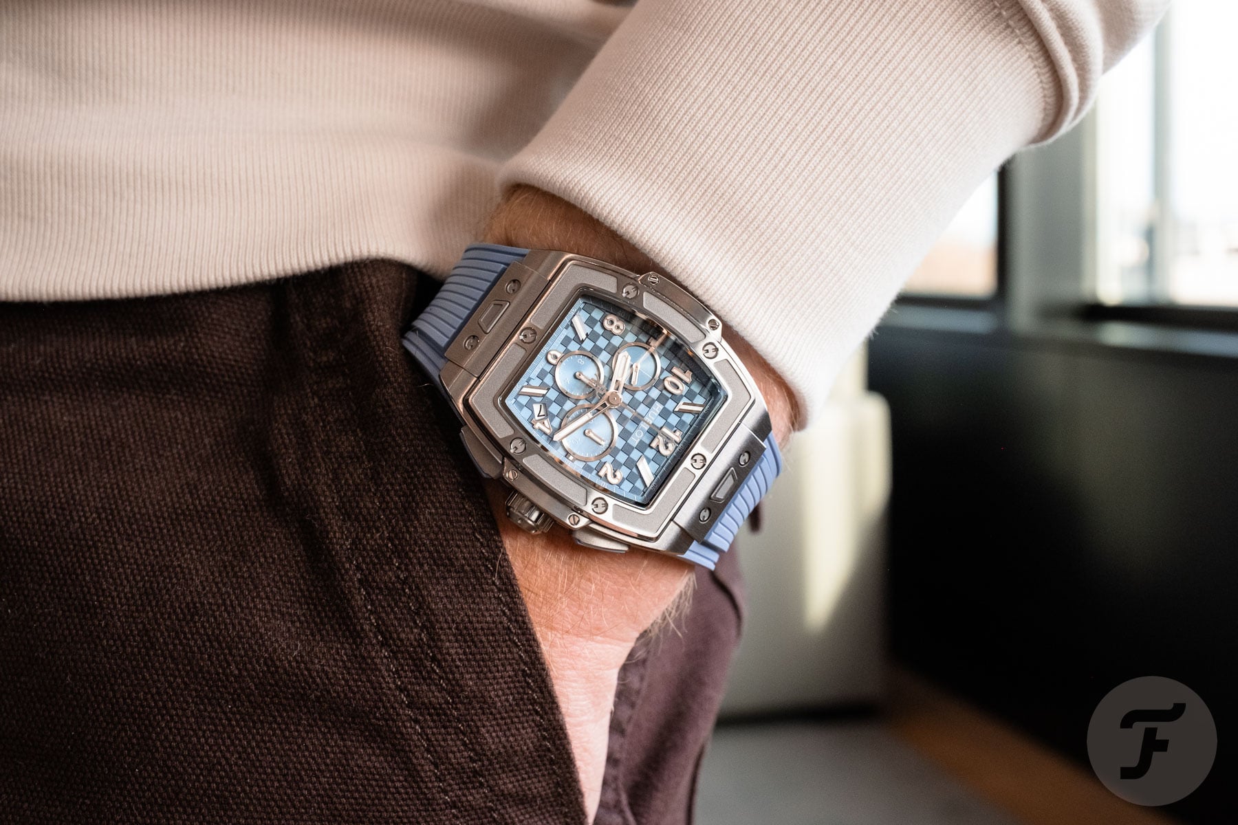 You will find the same soft Coal Blue on the dial and rubber strap here. Again, a checkered pattern breaks up the dial. This Spirit of Big Bang costs €22,800. The same colorway is also available in a small (32mm) version in steel with a diamond-set bezel, costing €21,600.