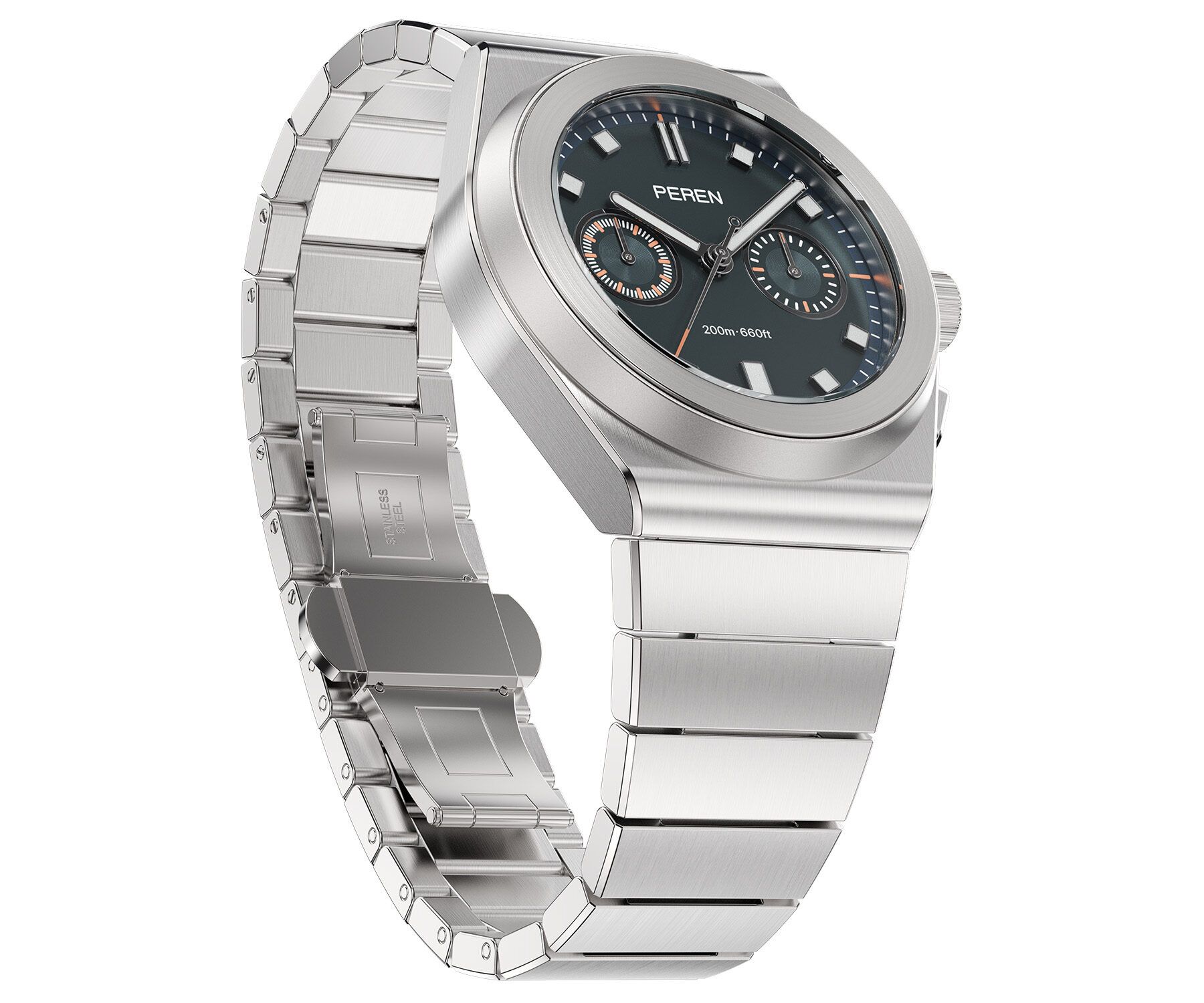 Finally, Peren kept the text on the dial to a minimum. The upper half contains the brand’s logo, while the lower half only displays the depth rating. Making the rounds above the dial are the diamond-cut stainless steel hour and minute hands, filled with white BGW9 Super-LumiNova that lights up blue in the dark. The stainless steel central chronograph hand features an orange tip to match the orange details on the dial. As you can see, the dial design is minimalist in style, but the execution is really detailed. It is what we have come to know from Peren and what makes the watches really interesting to wear.