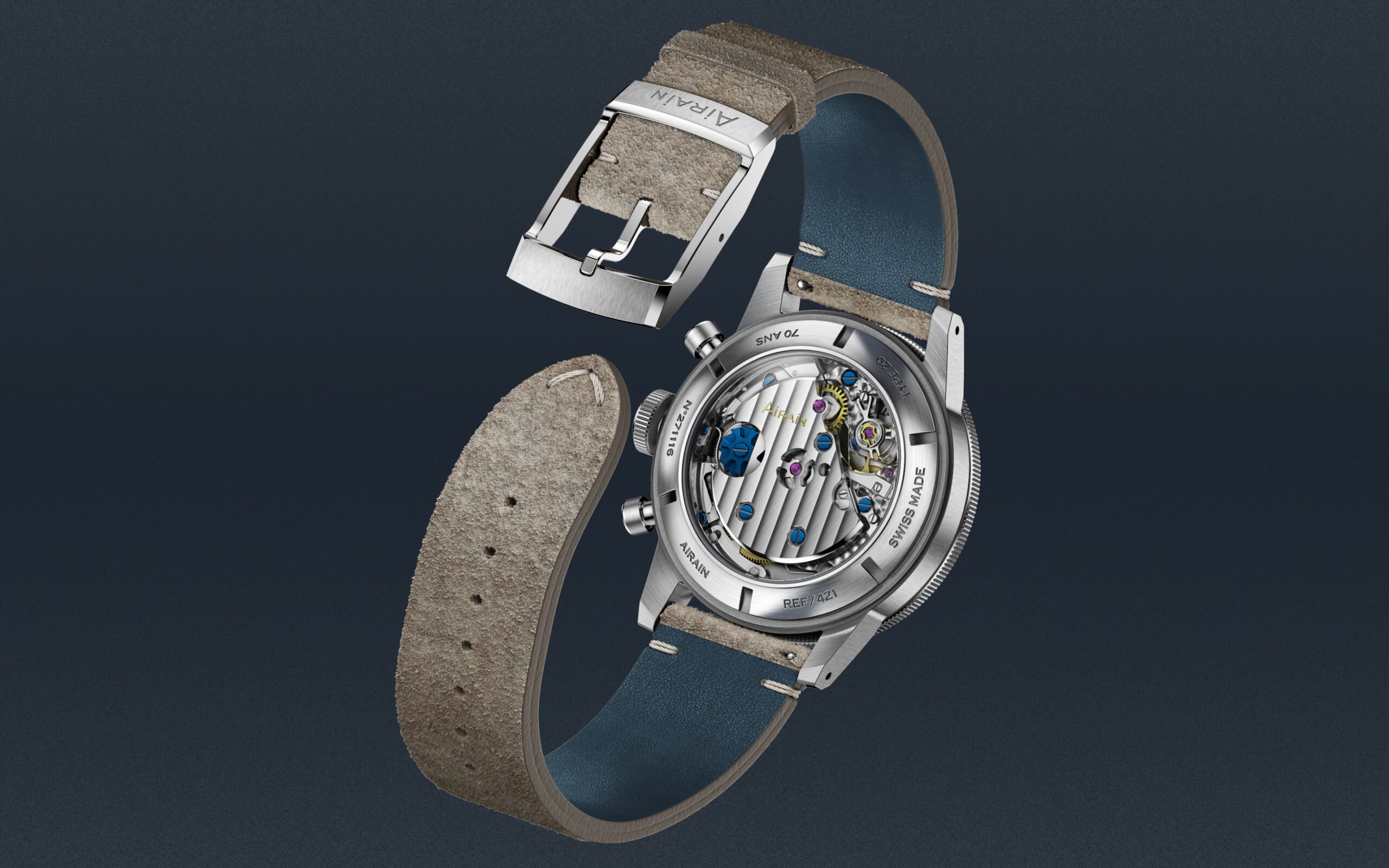 Inside ticks the caliber AM2 by Manufacture AMT. That’s Sellita’s elite department capable of delivering custom work. AMT provides Airain with a flyback chronograph based on the SW500 family. It runs at 28,800vph and offers 63 hours of power reserve. The one downside of this caliber is the fact that it isn’t quite as pretty as many hand-wound chronographs since it is basically a manual version of an originally automatic caliber. Still, it is good to have a look at it through the case back’s sapphire display, and the flyback functionality is a must-have for any Type 20.
