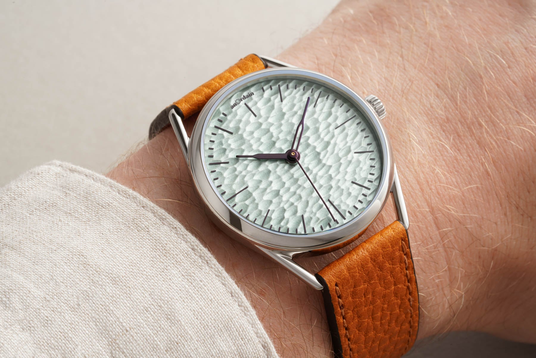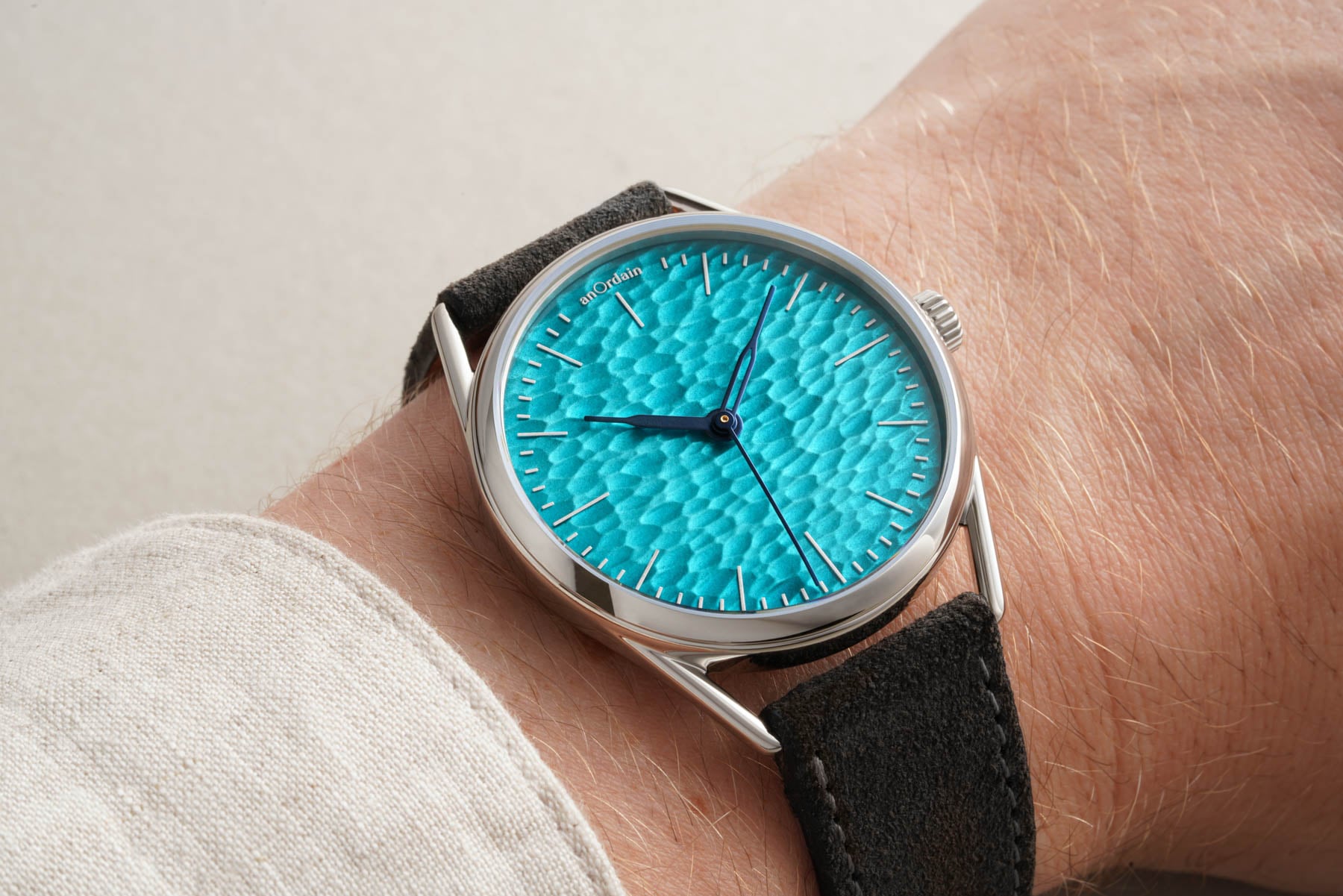 In May of this year, anOrdain premiered a new case on a limited-edition Model 3 in collaboration with Hodinkee. The watch came with a spectacular dark gray hand-engraved sunburst dial. Only 25 pieces were available, and all have sold out by now. Luckily, though, the Glasgow-based brand is back with another Model 3. This one features the same case, and this time, it’s not a limited edition. Instead of having a sunburst pattern, the new dial design mimics a carved block of wood. It comes in both Aqua and Lichen, colors specifically chosen to highlight that unique dial texture. Come take a look at the new anOrdain Model 3 Method.