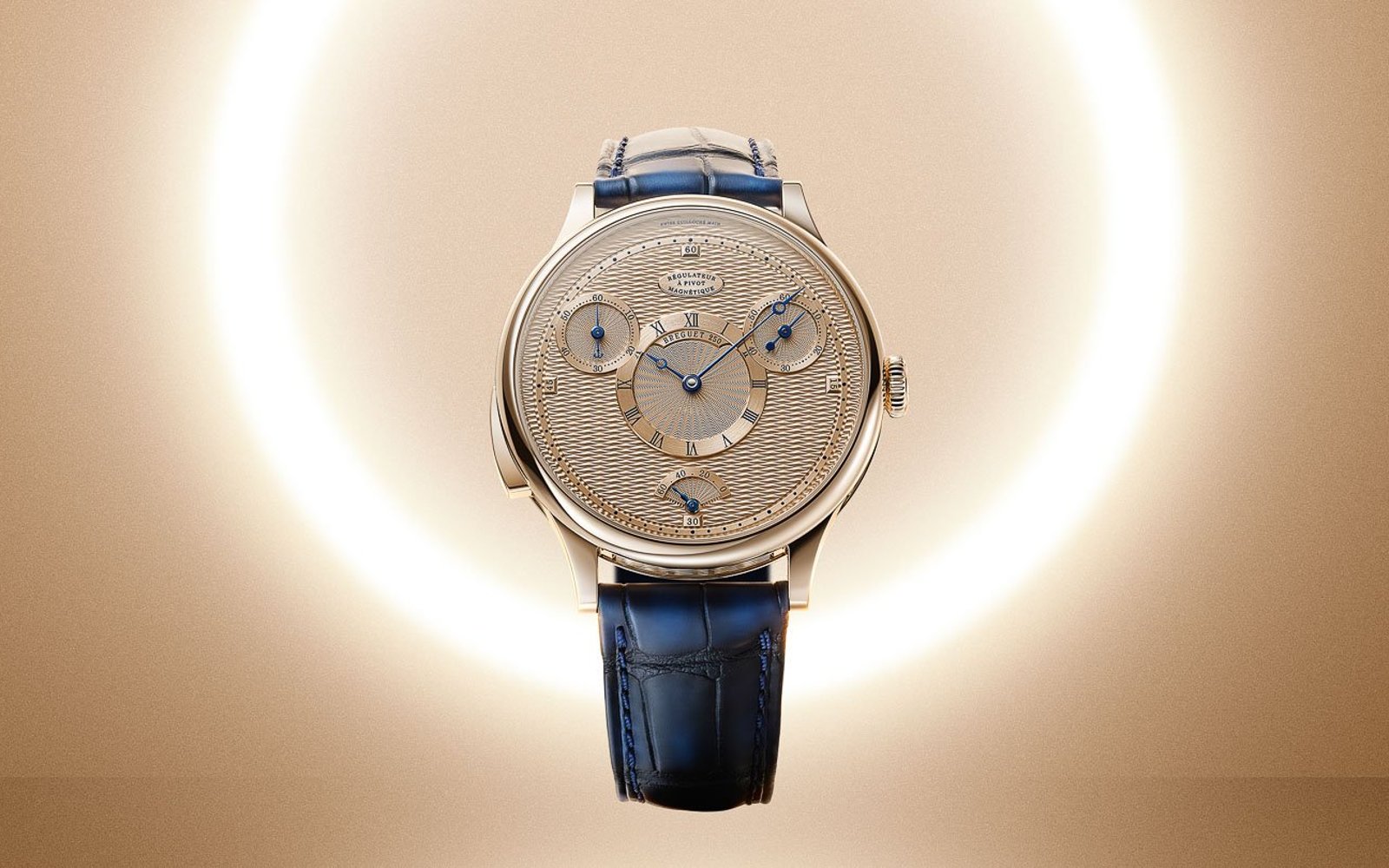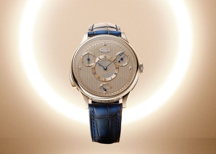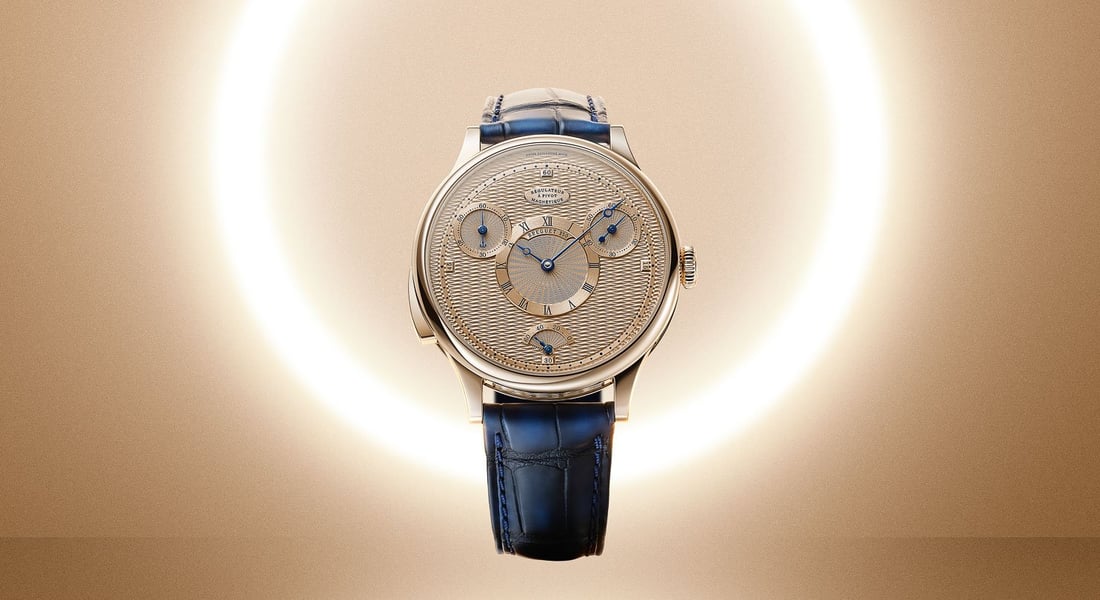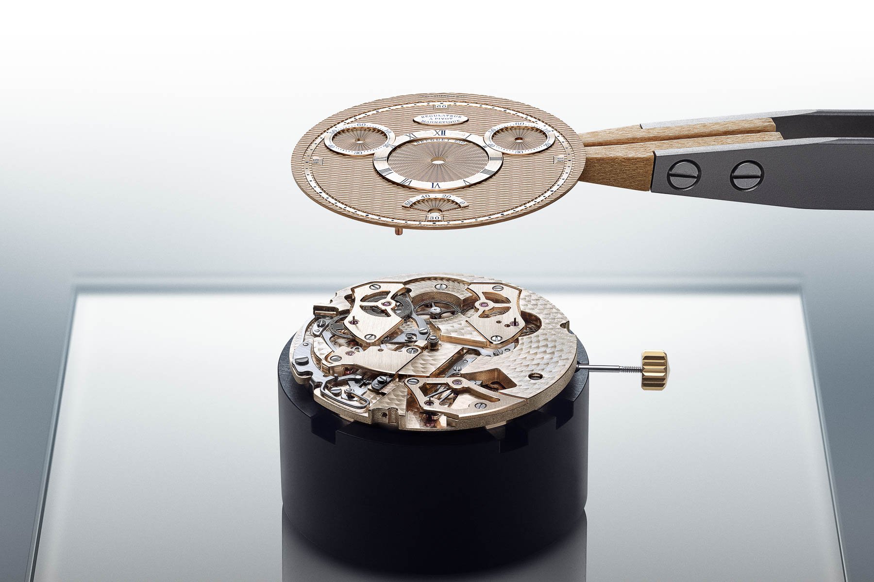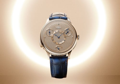 Design-wise, this watch shows inspiration from the No. 1176, a pocket watch offered from 1802 to 1809. Its 18K gold dial has a hand-guilloché “Quai de l’Horloge” pattern matching a similar motif on the case sides. This finishing contrasts against several circular-brushed sub-dial rings adorned with engraved and blued scales. The blue central hour hand aligns with the Roman-numeral-adorned ring, while the minute hand stretches far beyond it to the minute track enclosing all the sub-dials. A lower, arc-shaped display depicts the 60-hour power reserve. It becomes particularly interesting with the small displays on the upper right and left. Each shows running seconds, but the left register can be reset to zero using the pusher on the left flank.