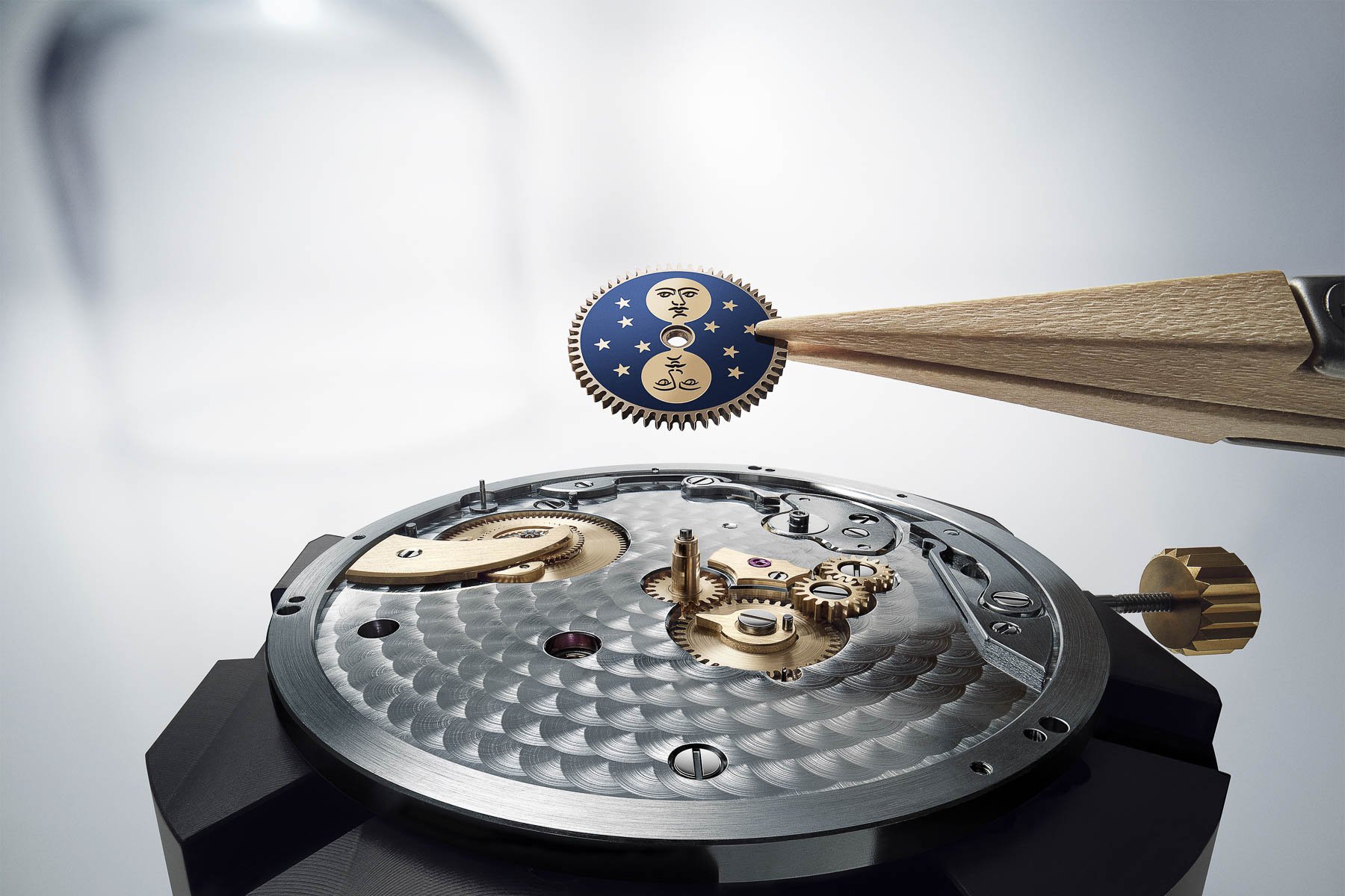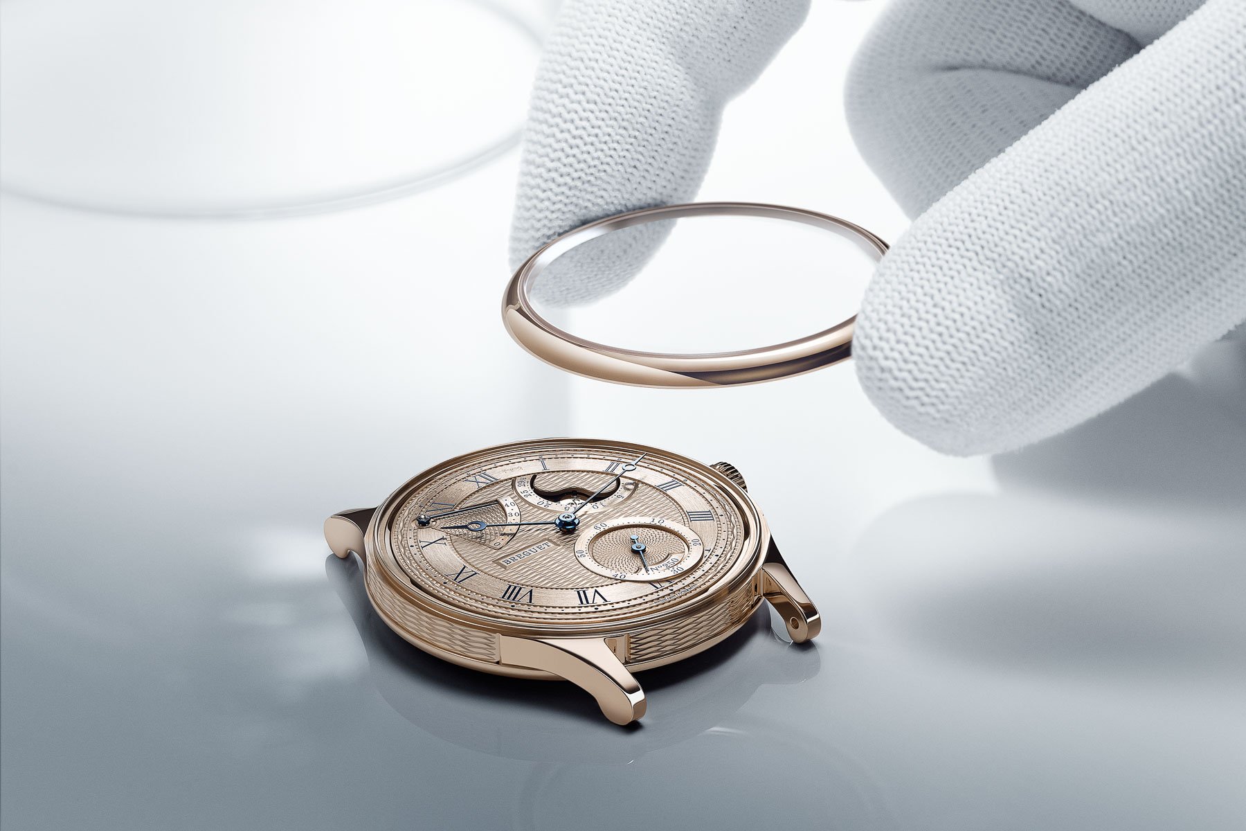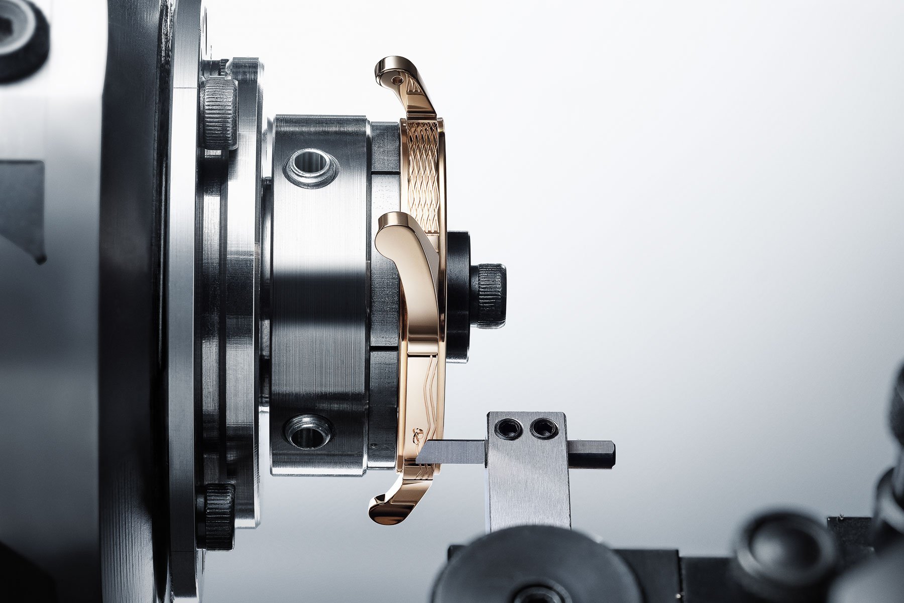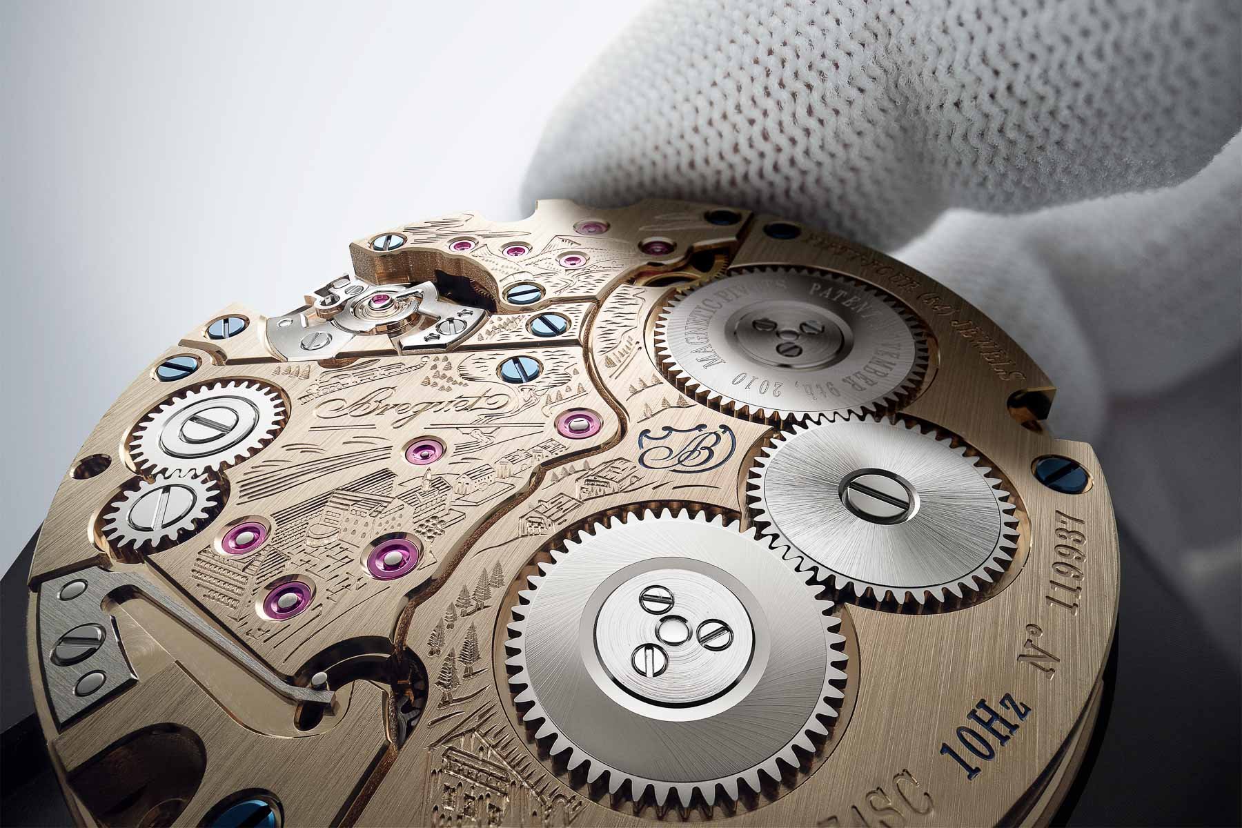 A sapphire display provides a view of the impressive manual-winding caliber 74SC. It is decorated by hand with a map of the streets near the brand’s original Parisian workshops. However, the most impressive details surrounding the caliber relate to its mechanics. This movement has a 10Hz frequency (72,000vph) and an accuracy of ±1 second per day. The technology at work is a magnetic pivot for the balance staff. Essentially, placing small magnets at the ends of the staff ensures that only the very end of it touches the jewel. This results in less friction and an ability to run at a higher frequency. Then, Breguet uses silicon for the balance spring, pallet lever, and escape wheel. On top of this, the movement is only 5.5mm thick.