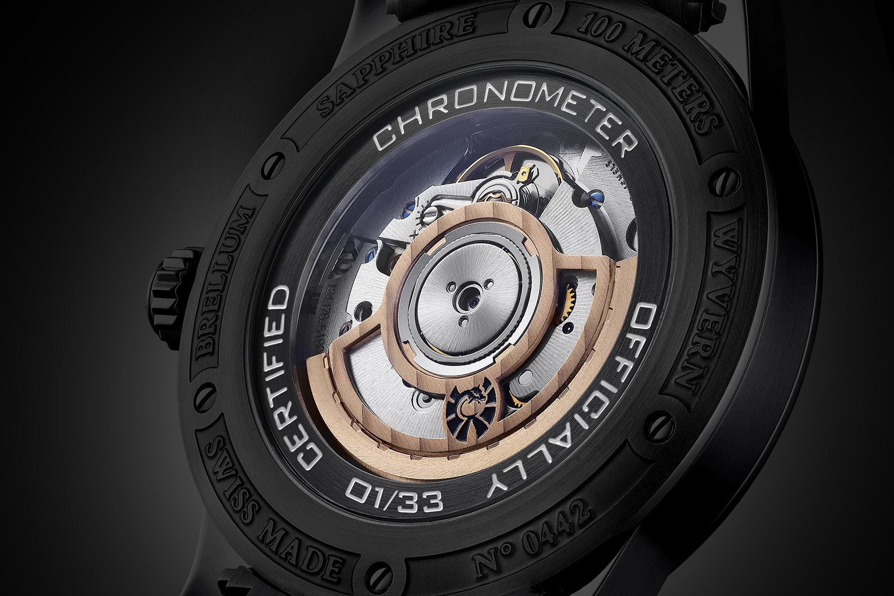 The highlight of this limited-edition model is the beautifully finished black DLC case. I must admit it’s not something I would have thought of myself, but seeing how the finish transforms the watch, I understand why Brellum took it in this direction. The finish extends to the crown and case back. This includes the engravings and the recessed ring below the sapphire window to the movement. The dark look of the case means that the wonderfully finished gold-plated rotor shines when you flip the watch over. With 100m of water resistance and 42 hours of power reserve, you’ll enjoy all the convenience of modern watchmaking.