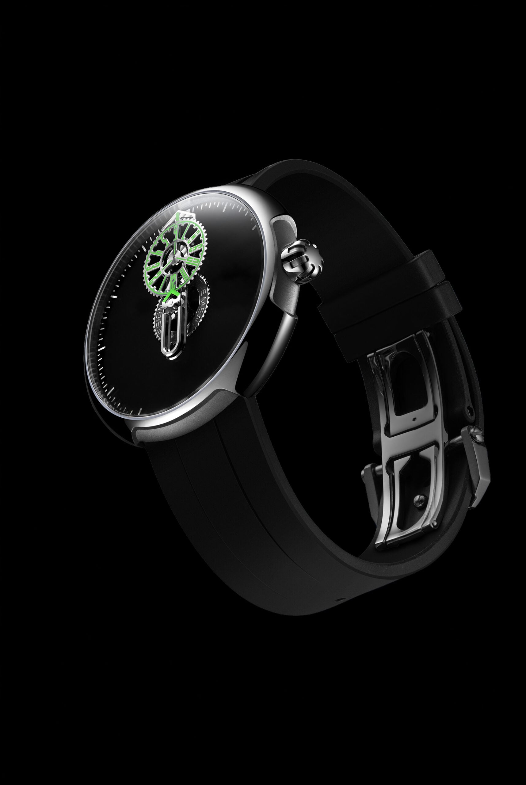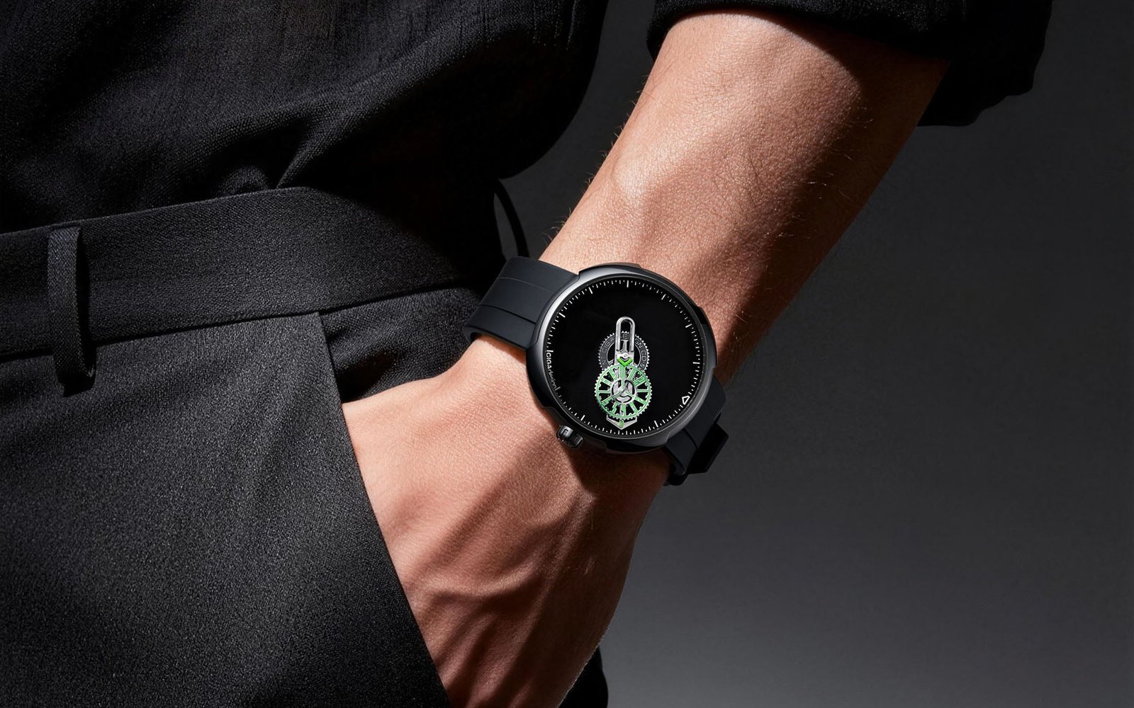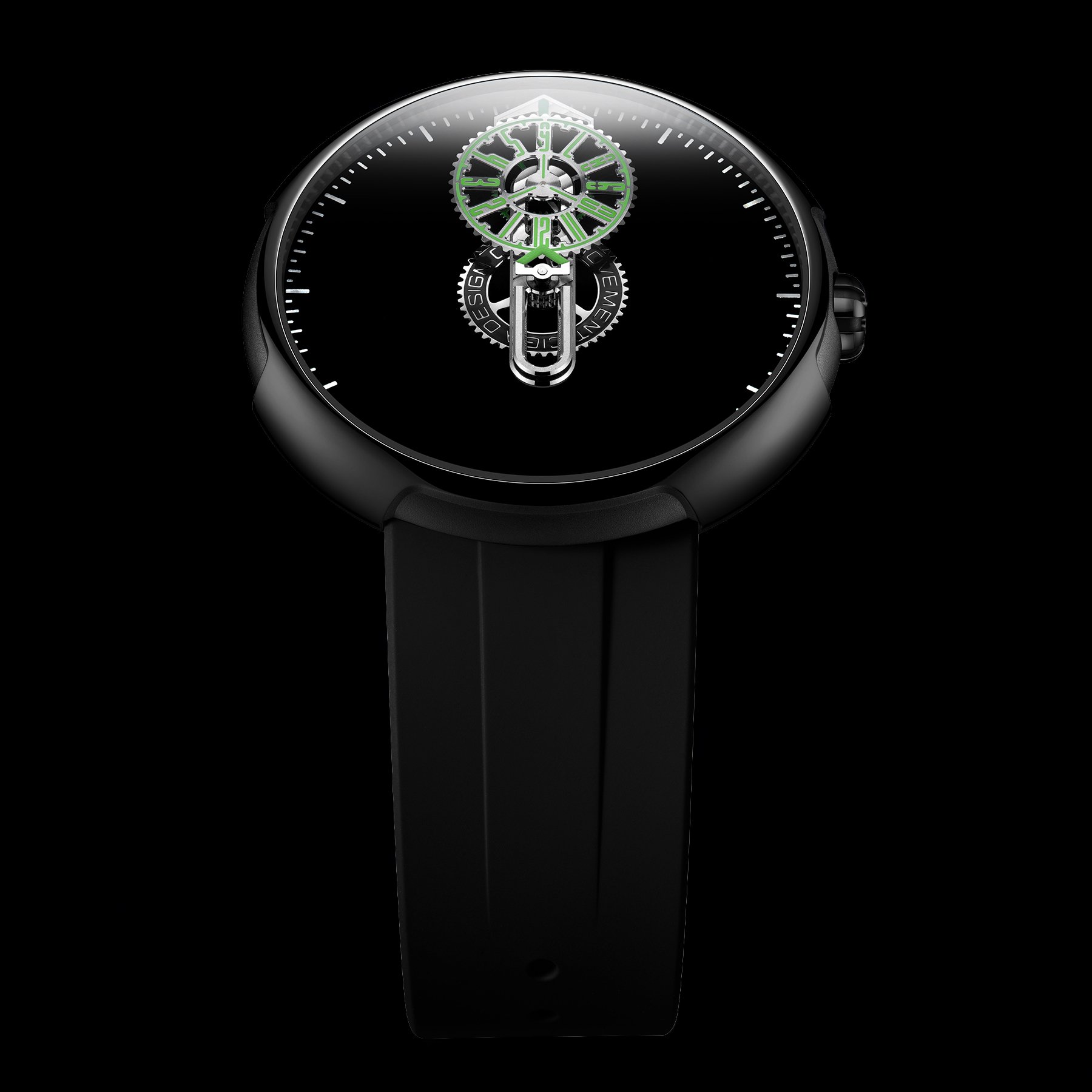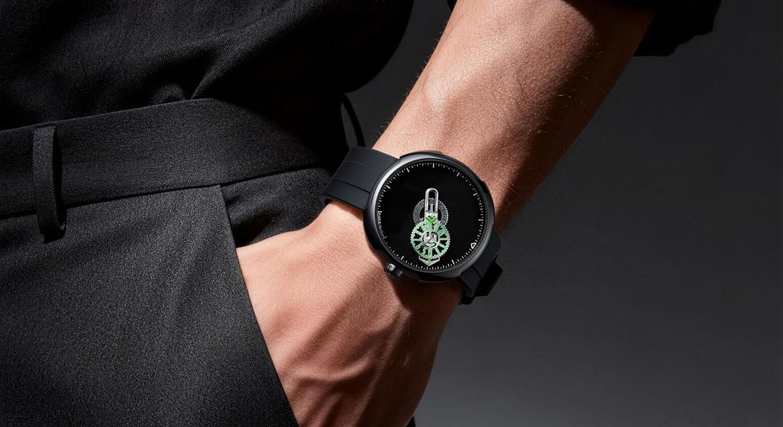 Underneath the domed sapphire crystal, you will find the Super Black dial that absorbs 99.3% of light. It is similar to the famous Vantablack dials that also absorb most of the light that touches them. The Super Black dial is the perfect backdrop for the wandering hours display. At the center is the large arrow-shaped indicator that rotates around the dial to display the minutes. Set on top of the minute arm is the slowly rotating hour disc, which indicates the hours via the centrally mounted indicator.