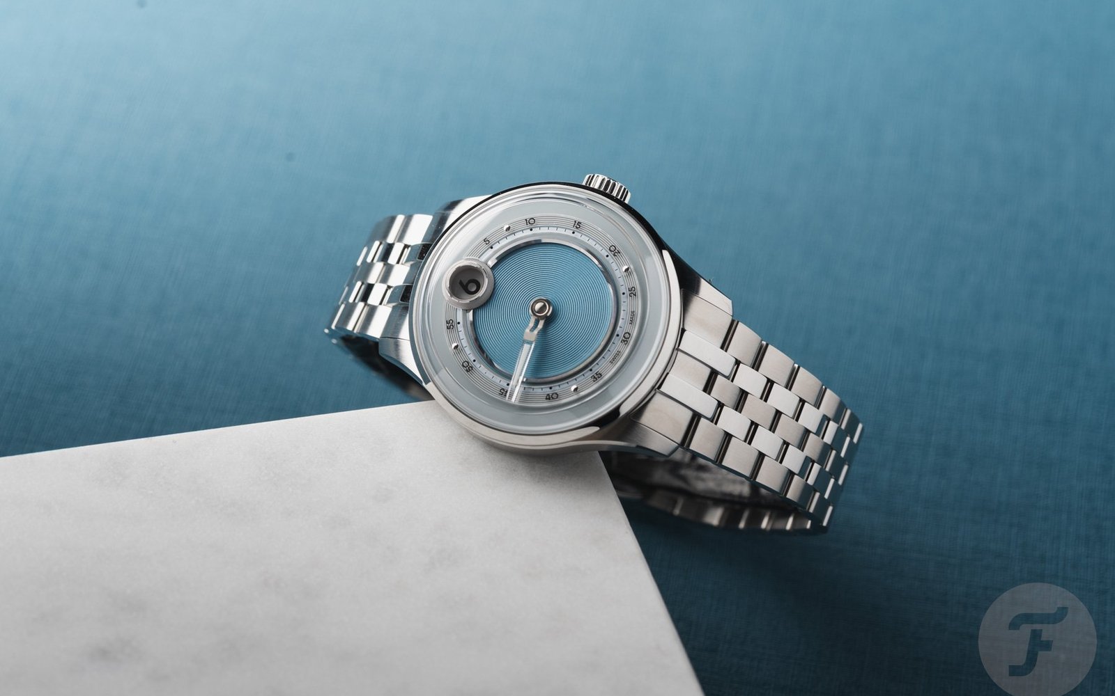 The dial construction is intricate but restrained. It features four layers — a stamped central disc with 27 concentric rings, a brushed and polished metallic frame, a sapphire minute track, and a stepped sapphire minute hand. The hour aperture sits backed by a ceramic Globolight insert for legibility.