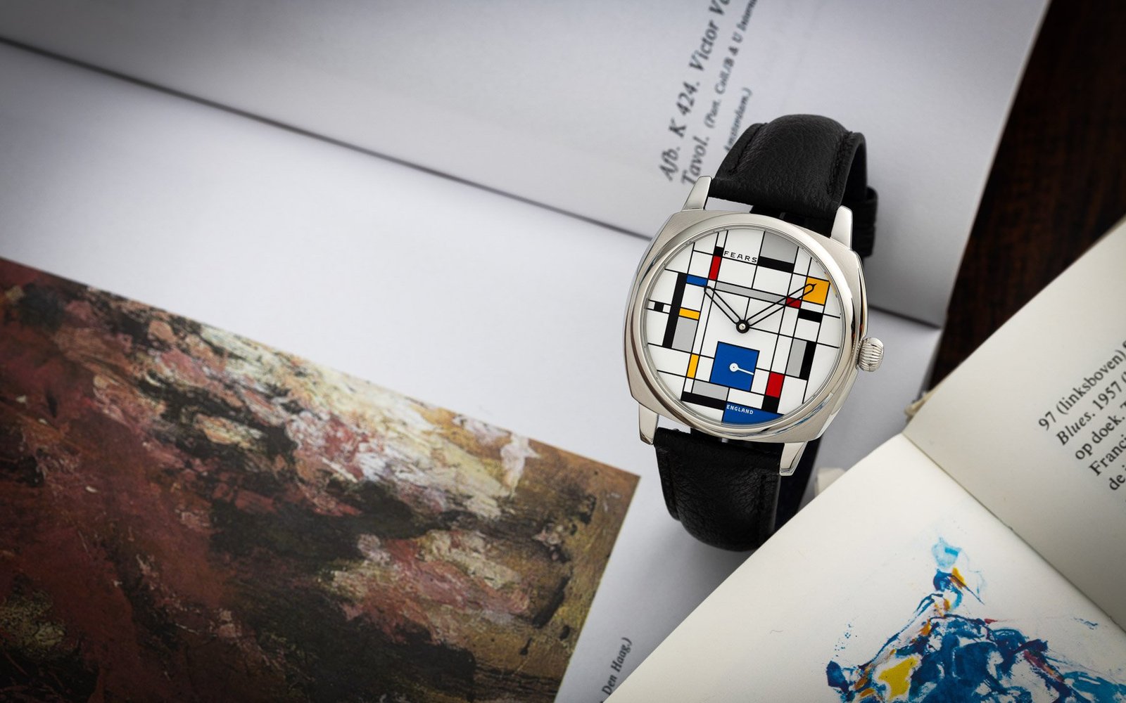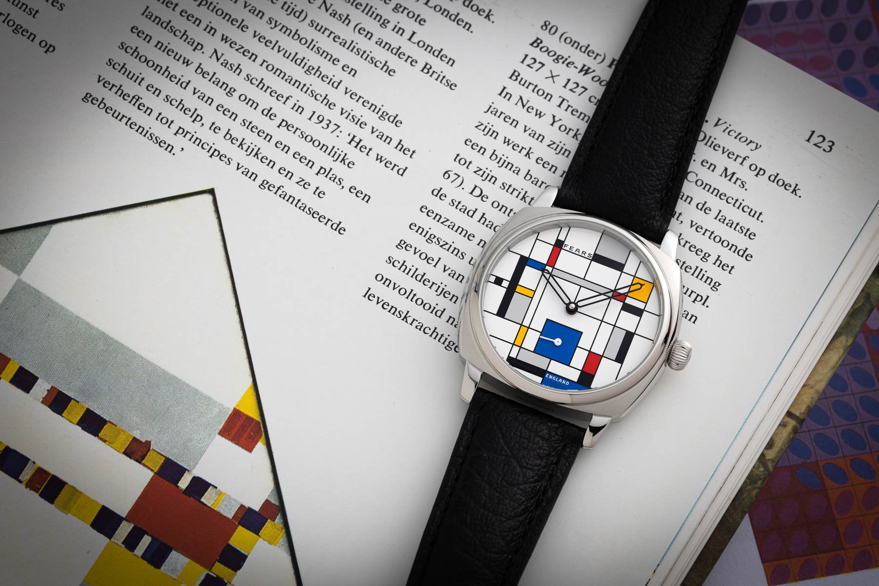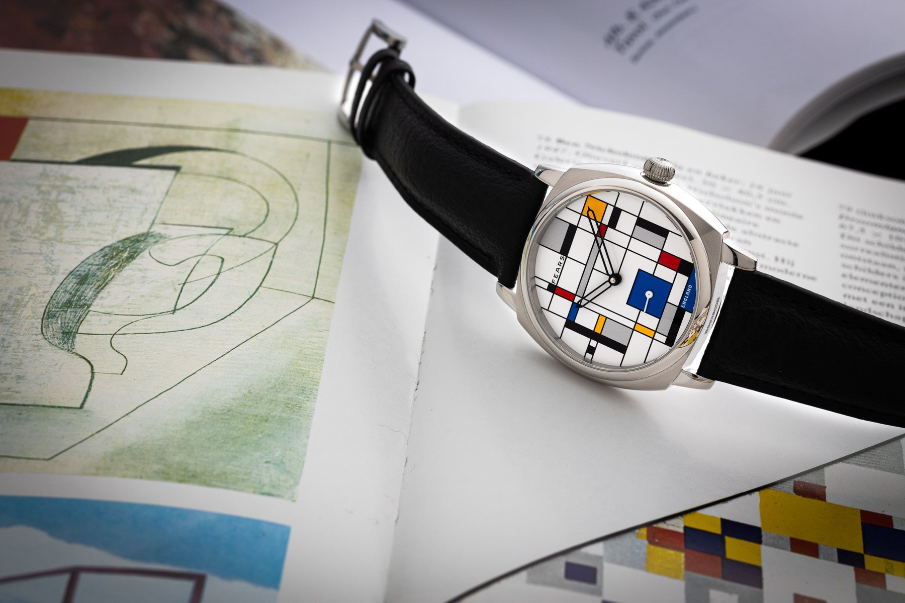 But, of course, the thing that’s most on-theme here is the dial, a composition of yellow, blue, red, black, and gray boxes. It was designed by Fears’s in-house designer Lee Yuen-Rapati. Mondriaan’s work was clearly a big inspiration here, but apart from looking good, the artwork is also functional. The black rectangles represent the hour markers, while the blue square at six o’clock functions as the sub-seconds dial. The black skeletonized hour and minute hands have the signature Fears shape, while the sub-seconds hand is straightforward and white. The dial might not be the easiest to read, but it certainly looks original.