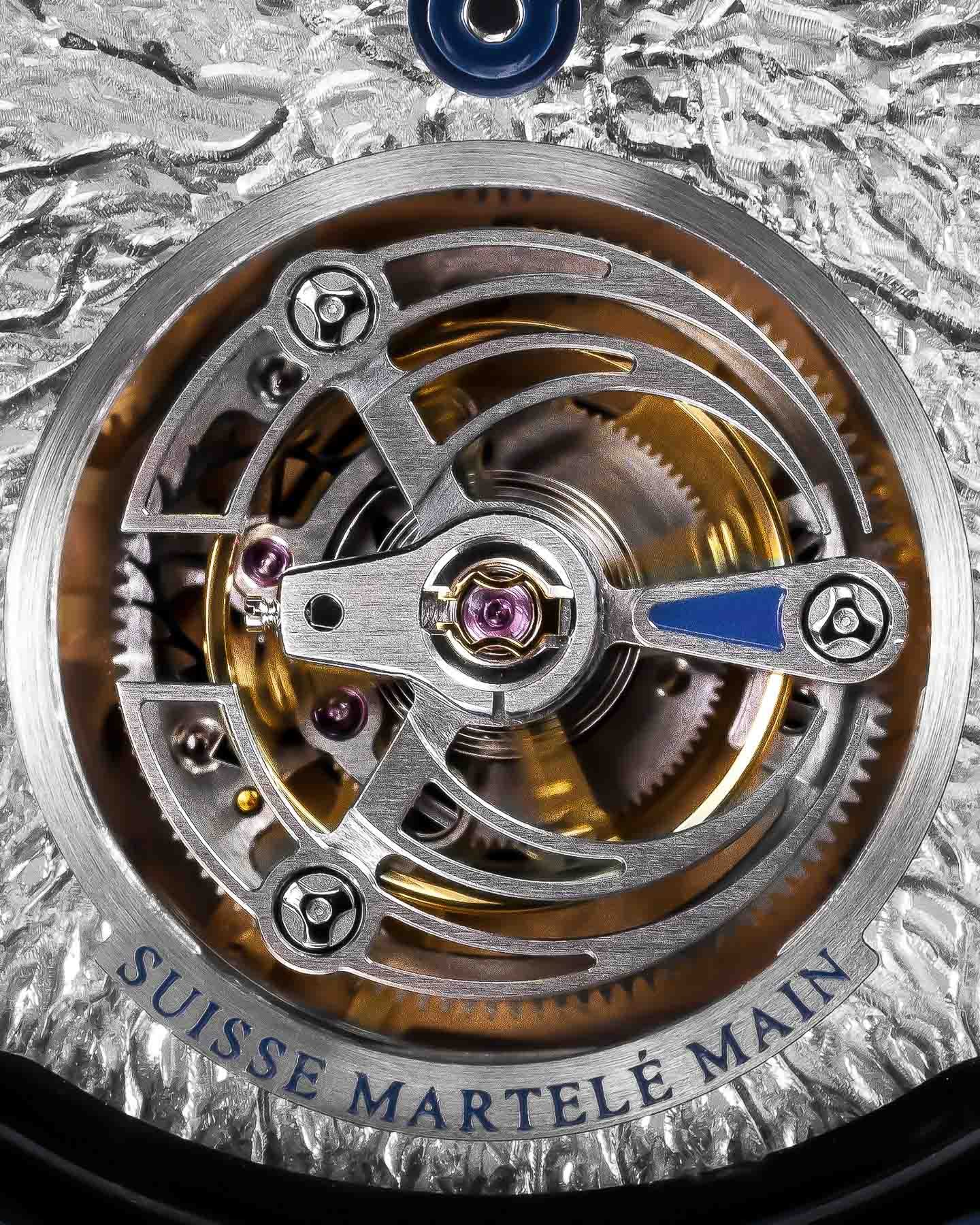 Gerald Charles shares that the dial is 18K white gold alloyed with palladium. To achieve its texture, a highly skilled artisan hammers the dial using a tool. The process takes approximately 23 hours with a production rate of two watches per month. This métier d’art creates a unique surface for each watch that radiates from the center.