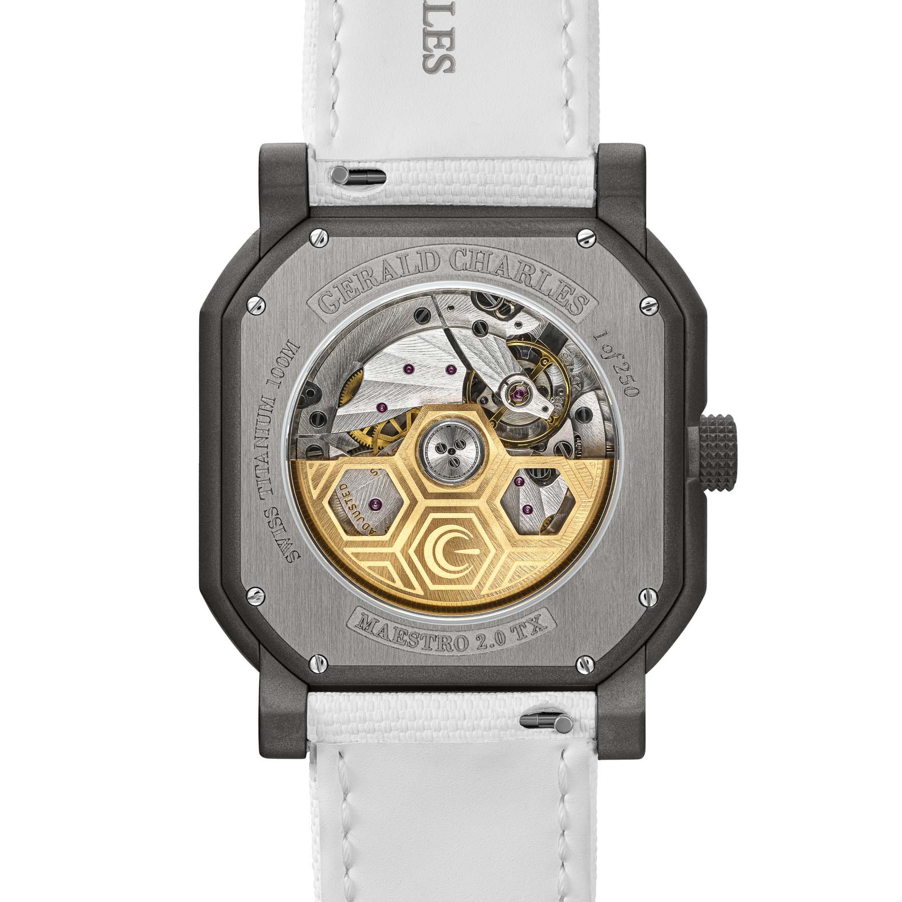 Unlike last year’s model, Gerald Charles doesn’t expressly call out Vaucher Manufacture Fleurier as the manufacturer of the GCA2001 automatic. However, from the photos and specs, our money is on it being the same. This translates to a caliber with 50 hours of power reserve and a frequency of 28,800 vibrations per hour. Moreover, the watch is finely decorated with perlage, colimaçon, and côtes de Genève. It’s visible through a titanium and sapphire case back.
