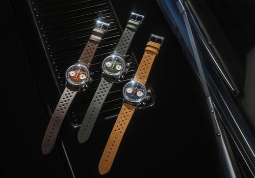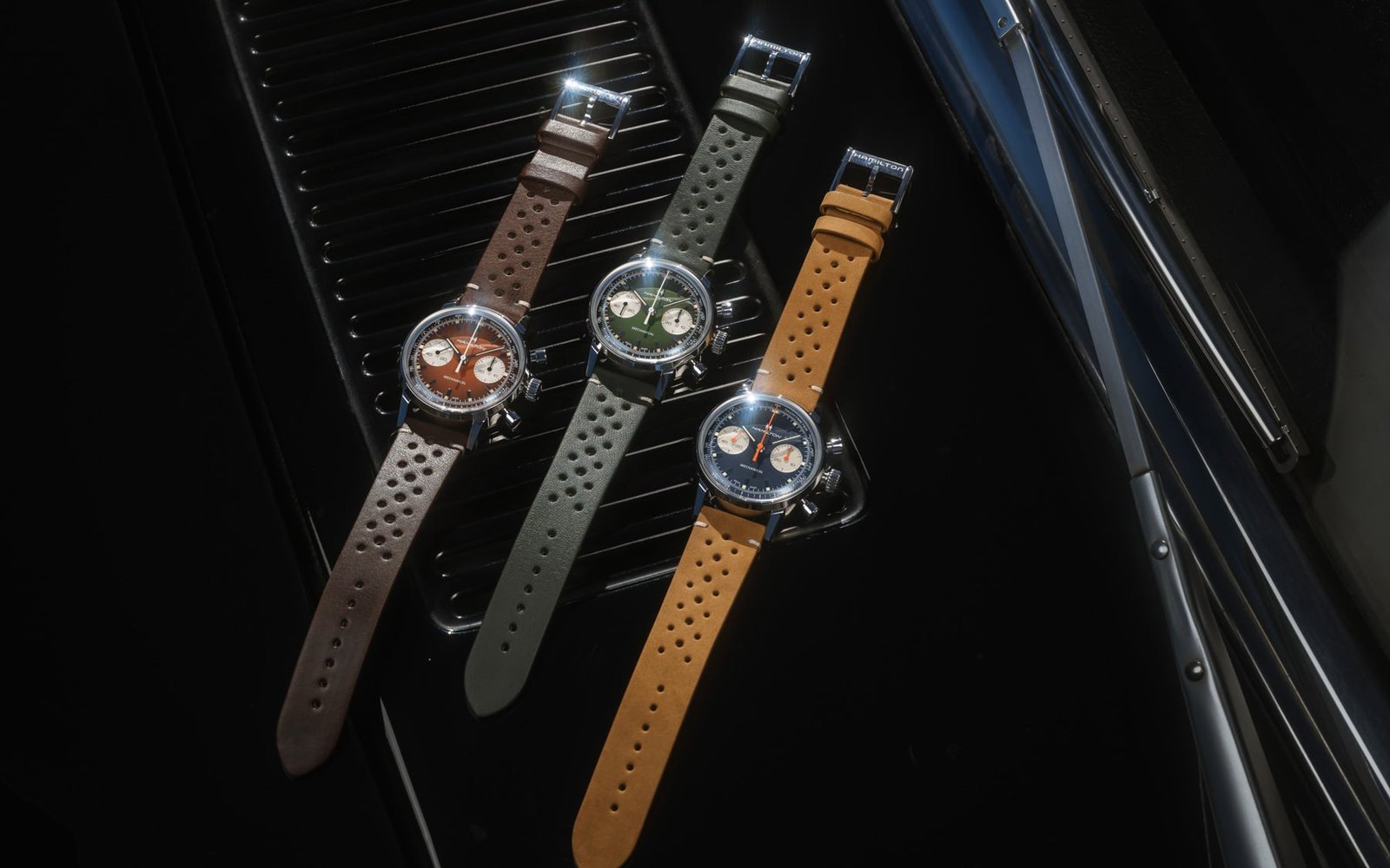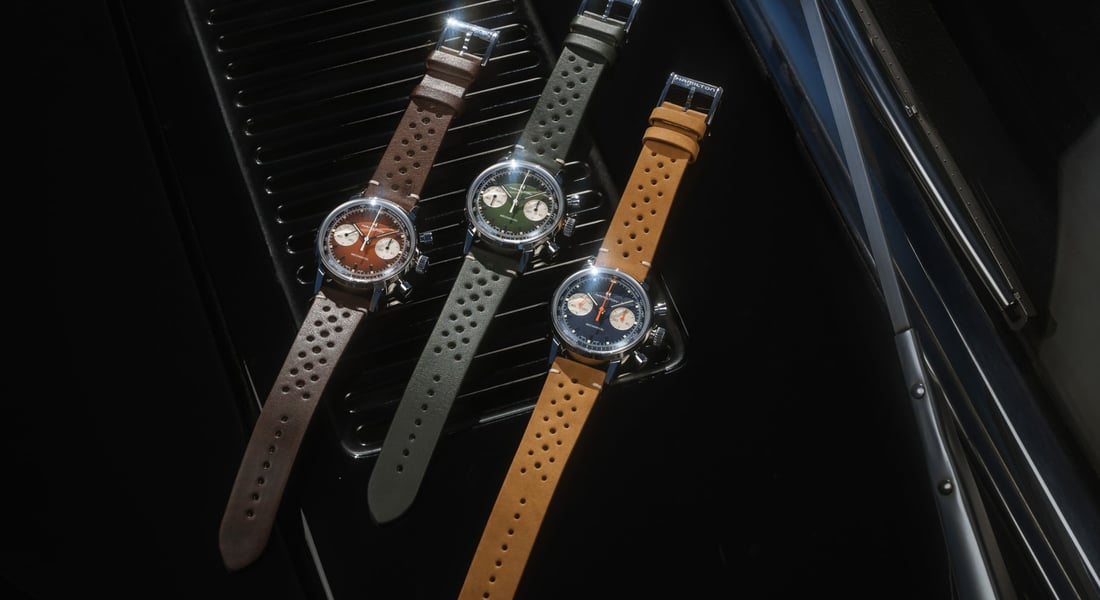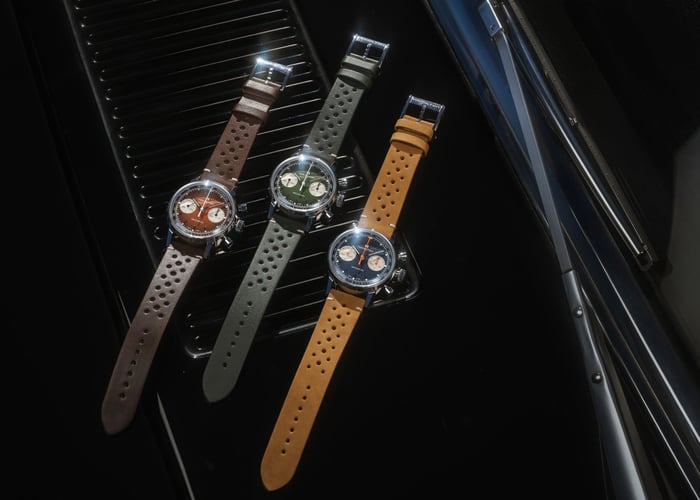 This seems to be the week of the reverse pandas at the Swatch Group. You probably already saw the two Speedmaster Professional Moonwatches with glossy black and white dials that Omega launched earlier this week. Now, Hamilton also introduces three new chronograph references. They are all inspired by the vintage racing culture of the ’50s and ’60s and come either with a green, brown, or blue dial with silver sub-dials. Also, they all house a hand-wound mechanical movement and come with both a perforated leather strap and a steel mesh bracelet.