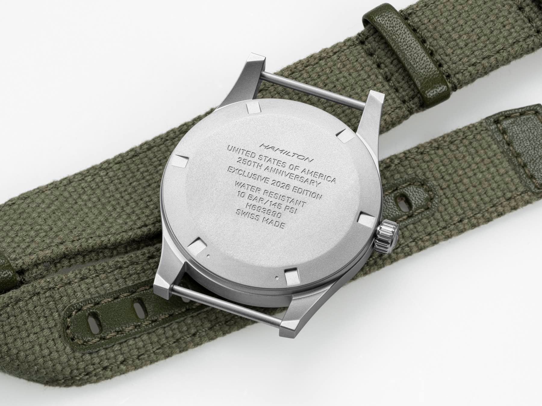 This latest Hamilton Khaki doesn’t just reference an old military watch; it also pays homage to its country of origin. The case back reads: “United States of America 250th anniversary,” referring to 250 years since the Declaration of Independence.