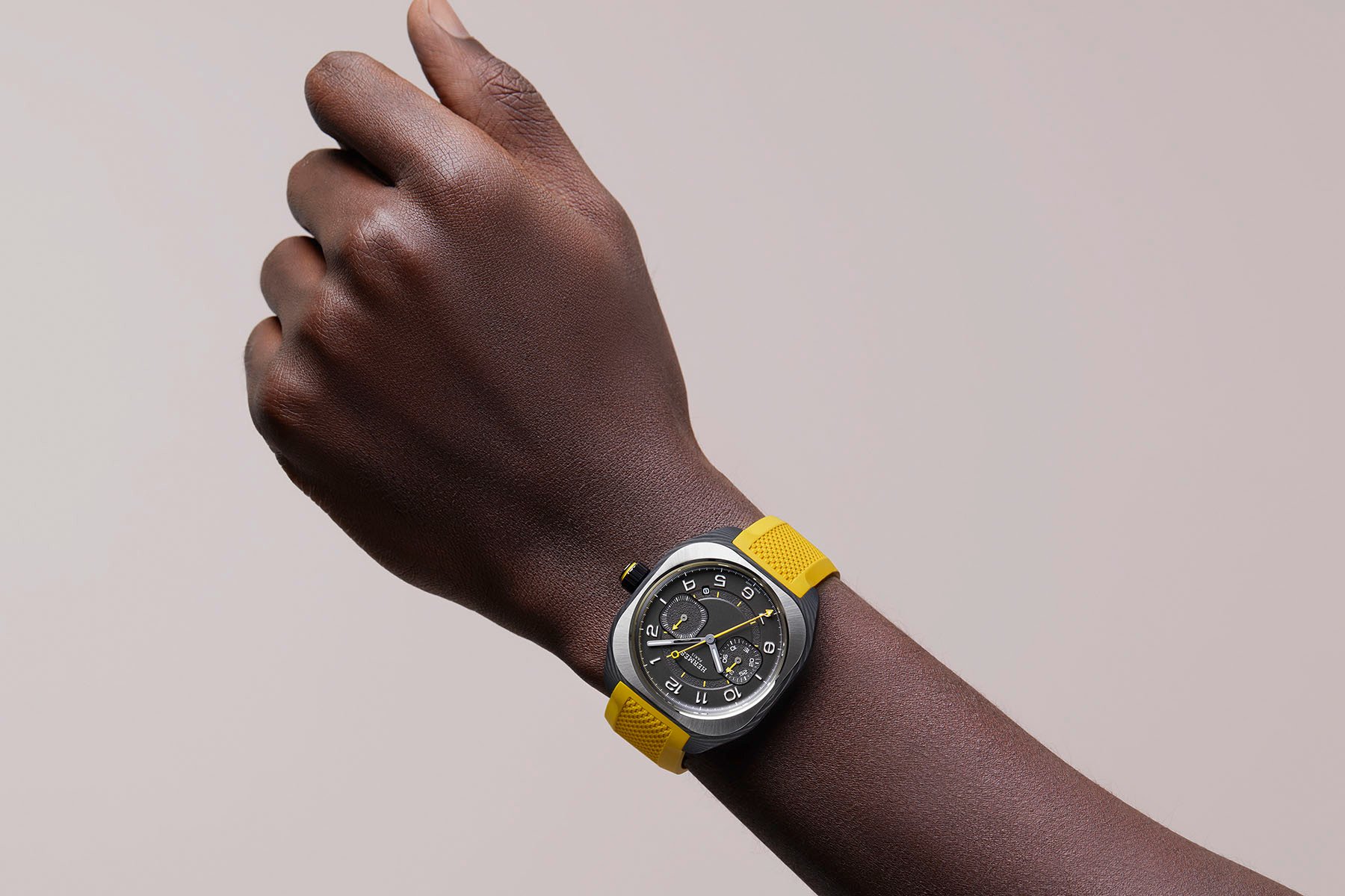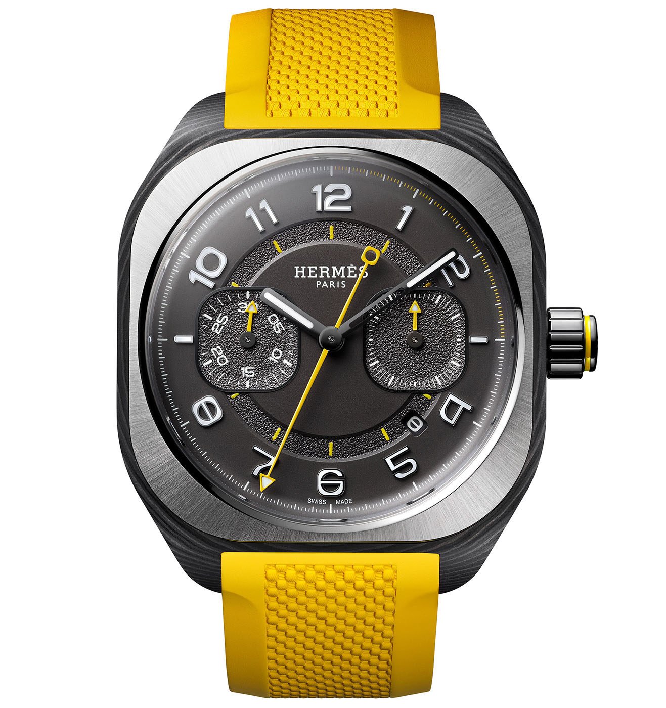 Jaune de Naples (French for “Naples yellow”) accents also appear on the subsidiary seconds hand at 3 o’clock and the chronograph’s minute hand at 9 o’clock. But for the main hour and minute indications, Hermès coats the hands in black gold and applies Super-LumiNova. The carbon fiber composite case coated with graphene powder continues the field-gear style. An impressive total of 176 thin carbon fiber sheets are layered and heavily compressed to form a strong yet lightweight structure. Carving out the cushion case shape then reveals a wood-grain effect. Contrasting this pattern is a sunburst-brushed titanium bezel with mirror-polished chamfers. A black PVD-coated titanium crown tops it off and houses the chronograph actuator with a yellow band. Hermès employs a dizzying variation of materials to reach its desired result. But the accomplished French brand excels in delivering a harmonious and high-quality design.