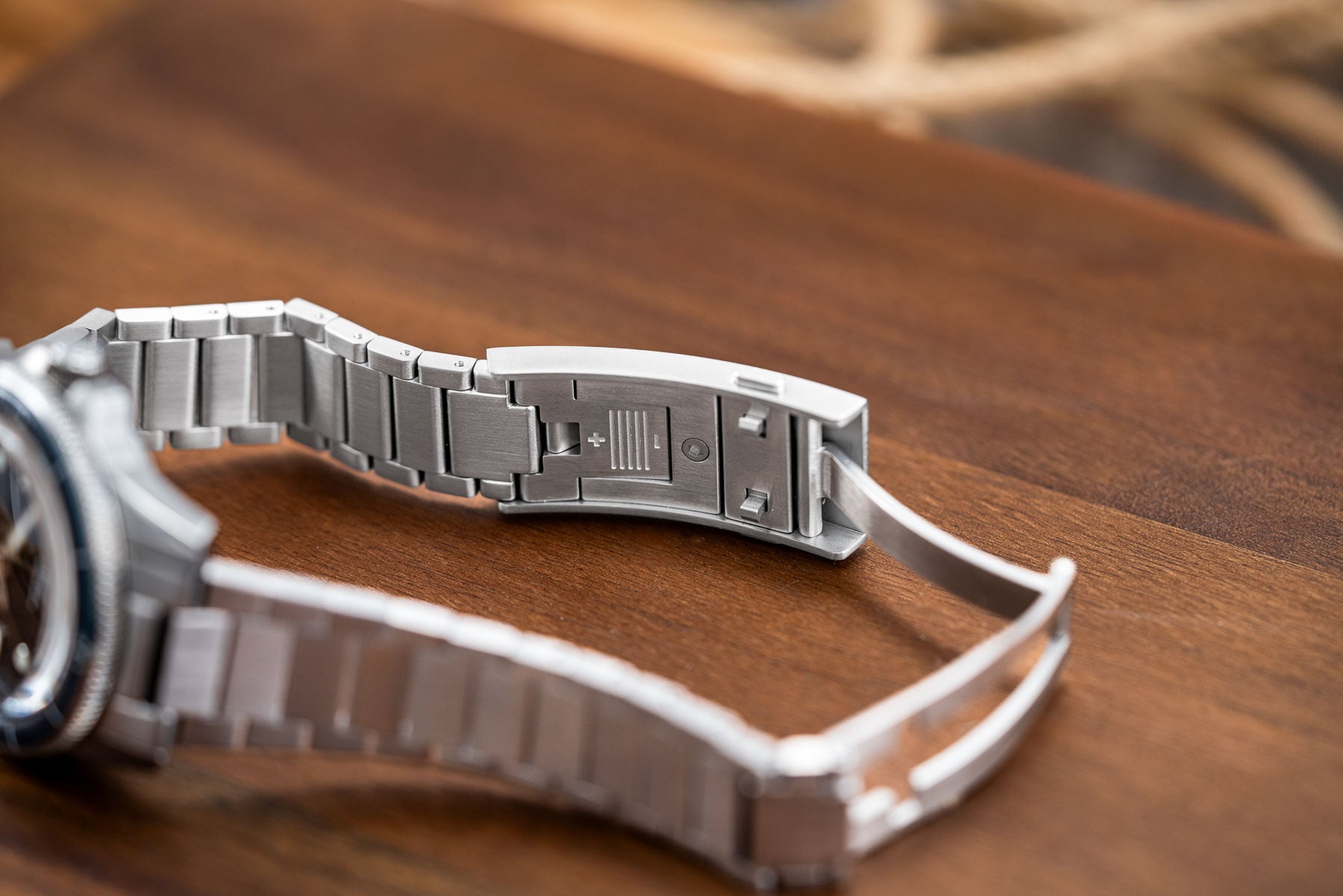 The Héron Marinor is yet another example of how smaller brands are adorning their watches with great bracelet designs. The watch comes equipped with a stainless steel three-row flat-link bracelet. From an adjustability perspective, the links use screws, and the brand includes a screwdriver for fitting. The push-button clasp conceals an underlying push-and-slide microadjustment extension. Finally, quick-release spring bars make removal a breeze if using a 20mm wide stap is of interest.