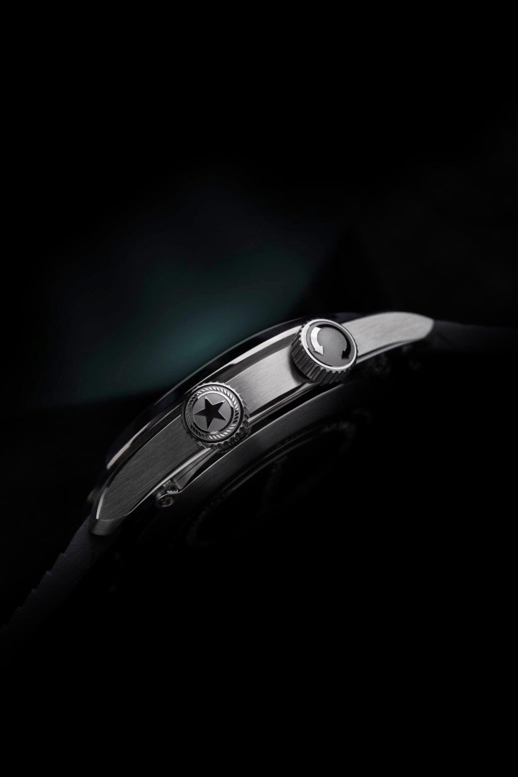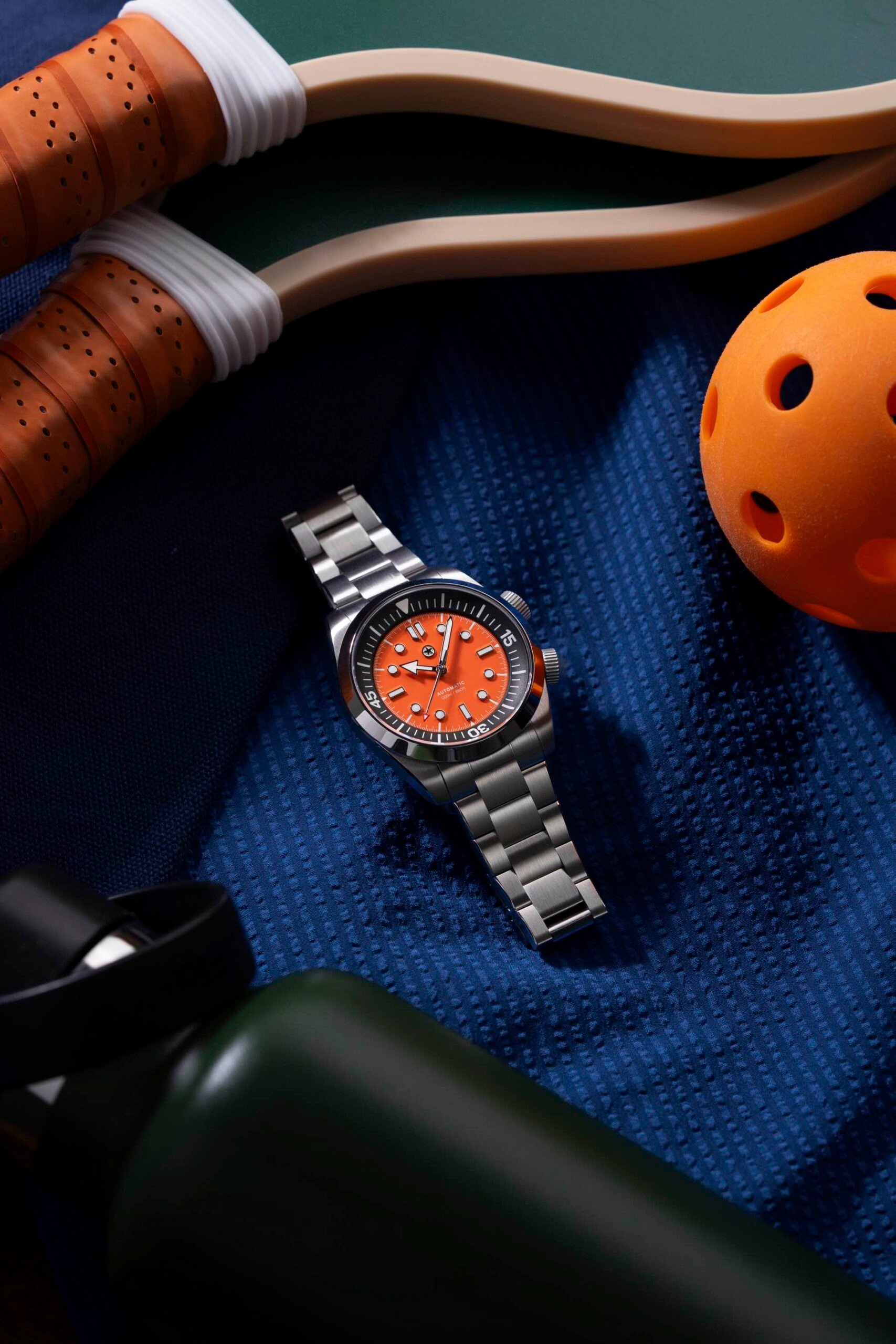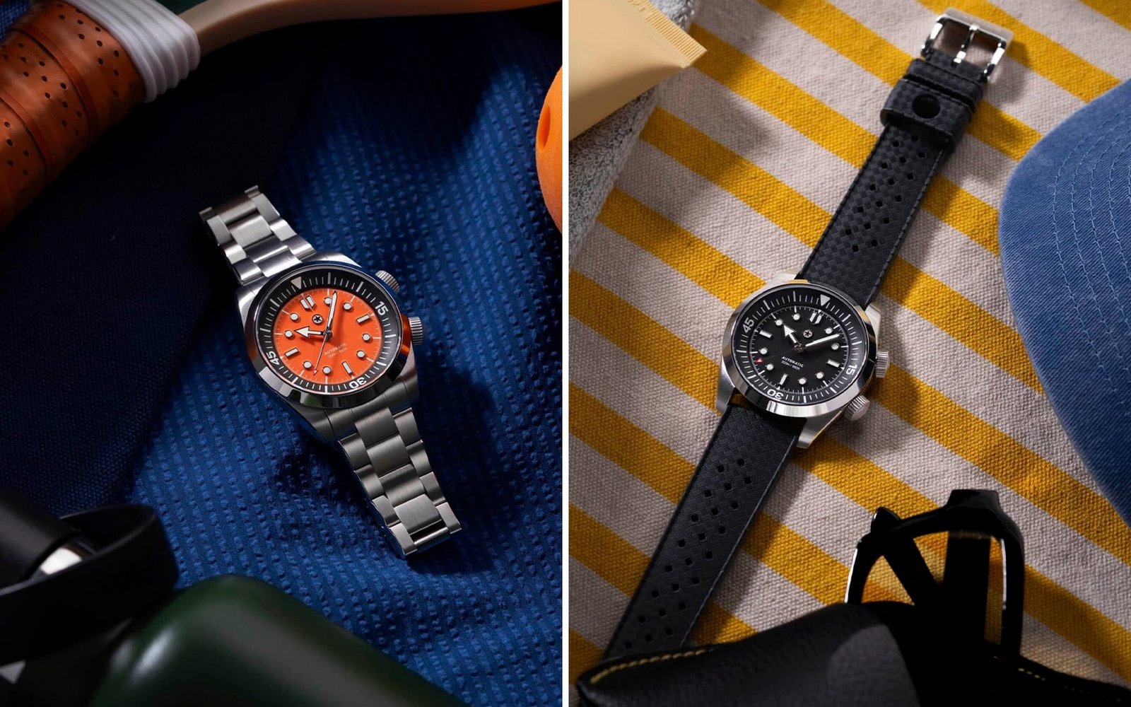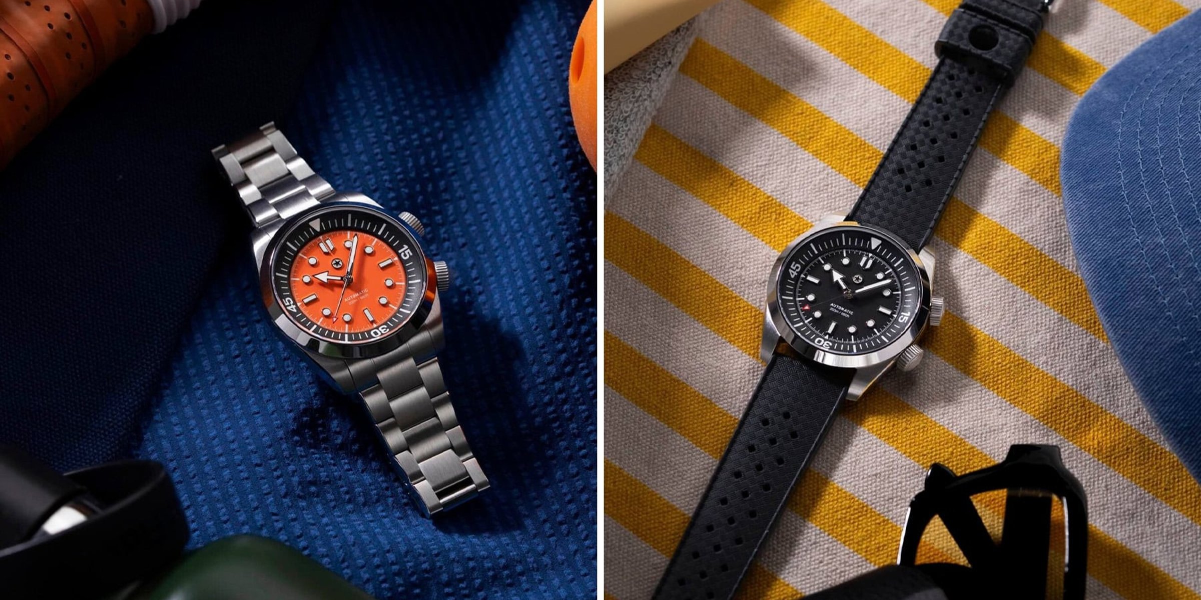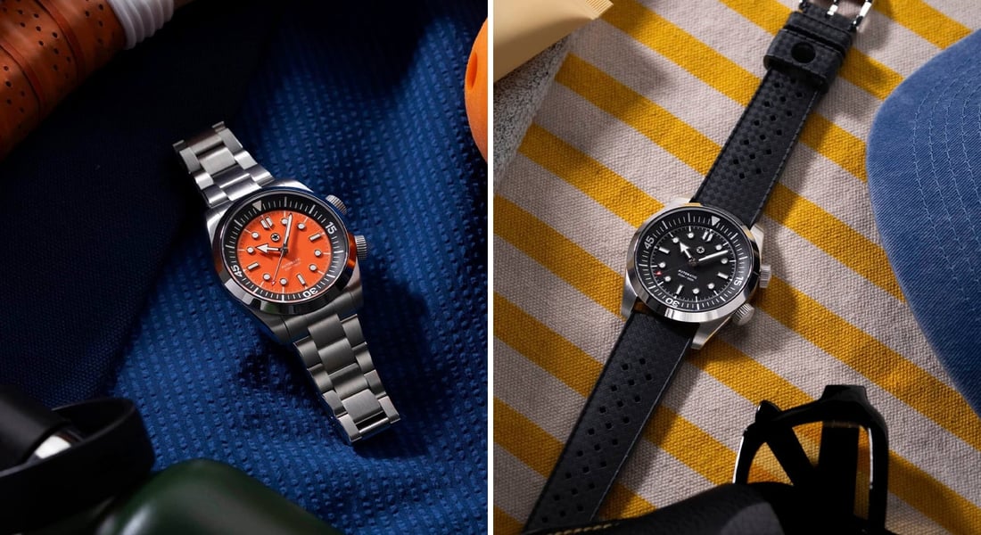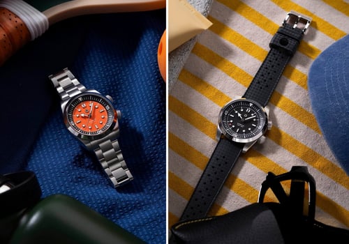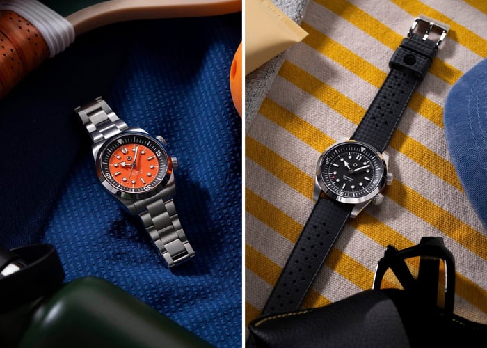 The watch features an internal dive-time bezel controlled via a second crown. Note that while this makes it look like the archetypal Super Compressor case, it isn’t. You can choose between Ash (black) and Ember (orange) dials. A third crowd-chosen option will also become available once a certain number of watches have been preordered — more on that later. The watch comes with your choice of a stainless steel seven-row bracelet or an FKM rubber Tropic-style strap.