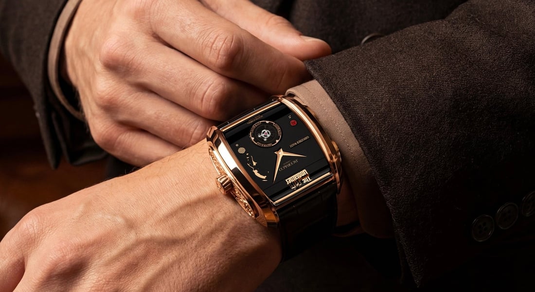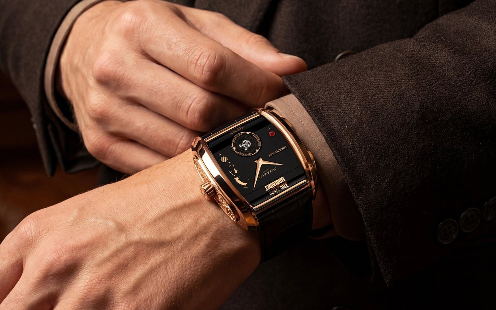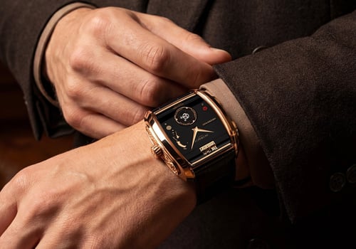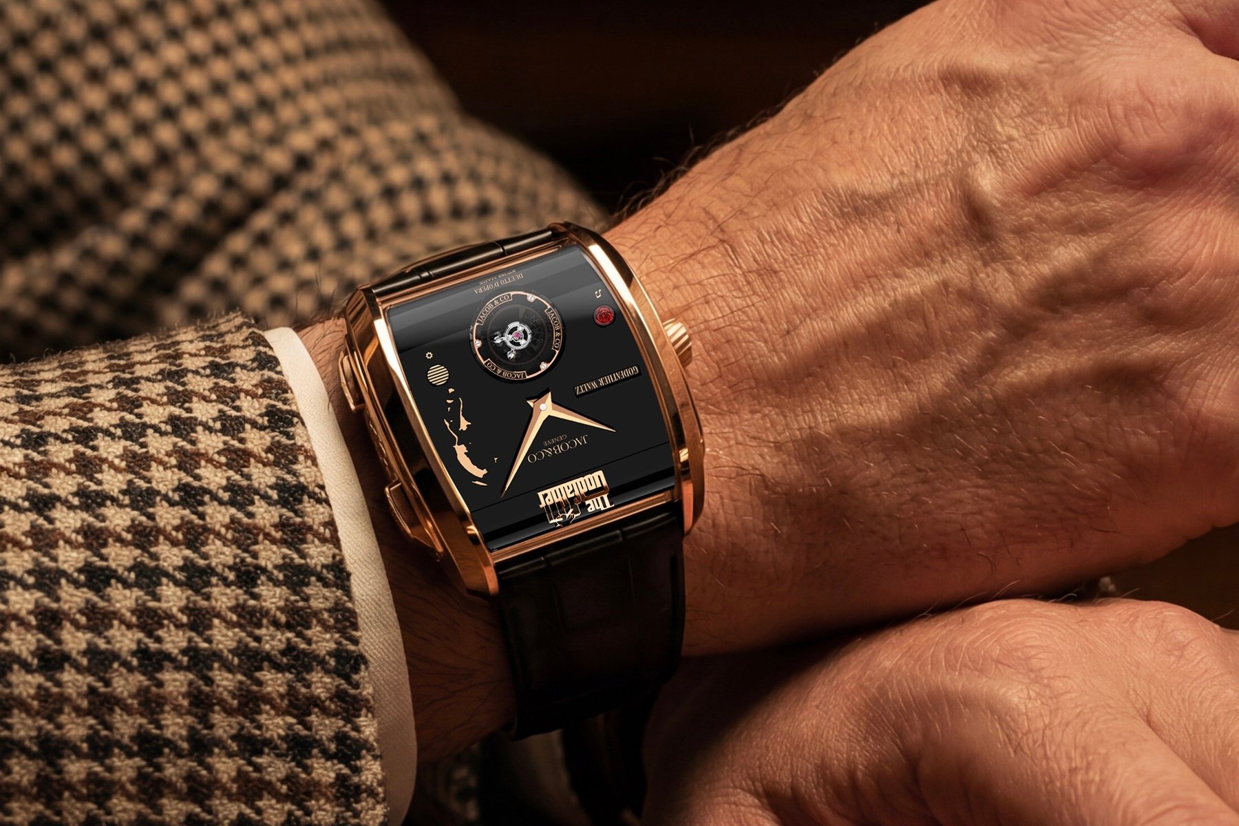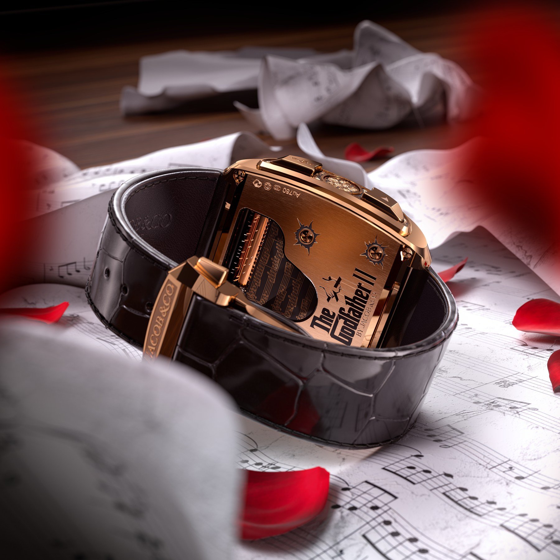 In The Godfather Part II, the character Hyman Roth says, “Good health is the most important thing. More than success, more than money, more than power.” Well, he forgot how important it is to wear a good watch — or an exceptional one. And that’s what the Jacob & Co. The Godfather II is. The latest Godfather timepiece comes in a new rectangular, curved, Art Deco-inspired rose gold case that also serves as a sort of boombox for the musical mechanism inside. The proportions are surprisingly subtle for such a complicated creation. Its 42 × 44 × 17mm dimensions are not over the top, and the curved, ergonomic profile is quite subtle.