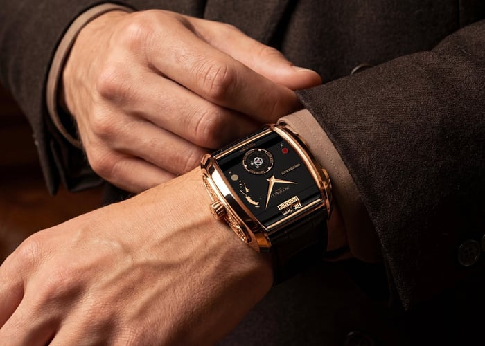 The Jacob & Co. The Godfather II is not the first Godfather-themed watch, but it is the first and only double-melody musical timepiece in the world. Yes, Blancpain recently revealed the Double Grande Sonnerie, but that’s a striking watch, and The Godfather II is not. Instead, Jacob & Co. built a timepiece with a single music-box barrel that can play two songs — “The Godfather’s Waltz” or “The Godfather Love Theme.” The music box is part of a 510-part movement housed inside a newly designed 42 × 44mm rose gold case. The watch is a limited edition of 74 pieces, a nod to 1974, the year The Godfather Part II debuted.