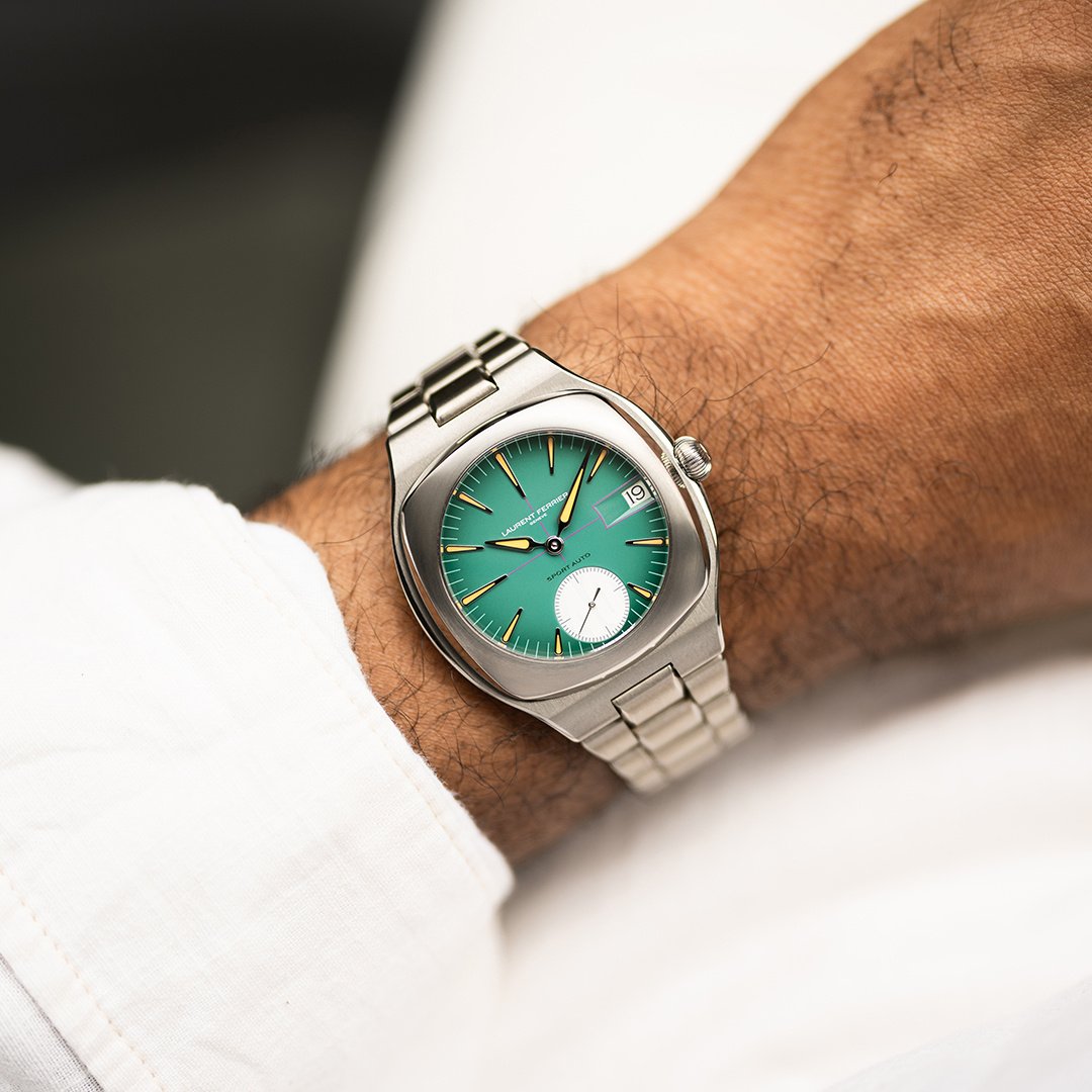 I am a nerdy petrolhead at heart and got the dial inspiration when I clocked the color combination. For me, car-racing-inspired watches are usually inhabited by too-literal references and logos. But the design of Laurent Ferrier pulls off an unusual hat trick. It is fresh yet understated with its gradient opaline surface, but zoom in for the subtle details. The inspiration comes from the no. 40 Porsche 935 driven by Ferrier, Servanin, and François Trisconi.