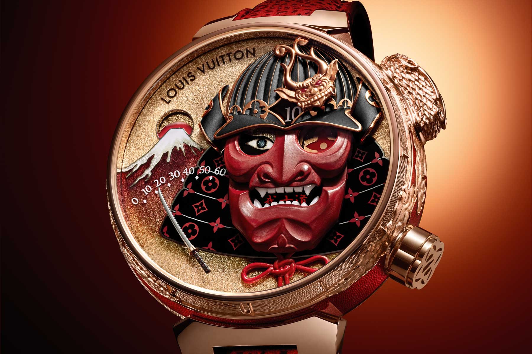 Louis Vuitton’s first example of high watchmaking is the Tambour Bushido Automata. It’s a stunning example of mechanical watchmaking and métiers d’art that required hundreds of hours to create. Functionally, this 46.8mm by 14.4mm 18K pink gold watch features jump hours, retrograde minutes, and a power reserve indicator.