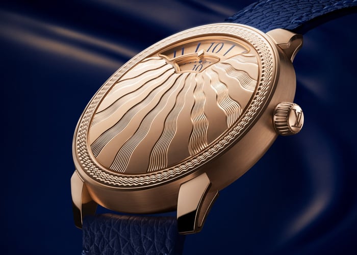 It’s now time to explore the novelty of this year’s Louis Vuitton Tambour Convergence —its guilloché front. Of course, the apertures for the hours and minutes are still there. Their shape was inspired by the rising Sun. This time, Louis Vuitton takes the theme to the next level with the addition of an array of undulating rays and a rippling halo all around the façade. For the circular pattern, LV used a hand-turned rose engine from 1850. The sunrays in the center were created with a hand-turned straight-line engine from 1935. Both machines were restored in-house at the brand’s La Fabrique du Temps. It took approximately 20 trials and over six months to achieve the desired result on the engravings.