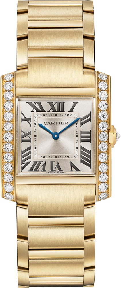 The 18K yellow gold Tank Française models consist of four references, but there are just two different sizes. Each size also has a variant with a diamond-set crown and brancards. The WGTA0114 is identical to the WJTA0039, except the latter features 23 brilliant cut diamonds, totaling 0.78 carats.