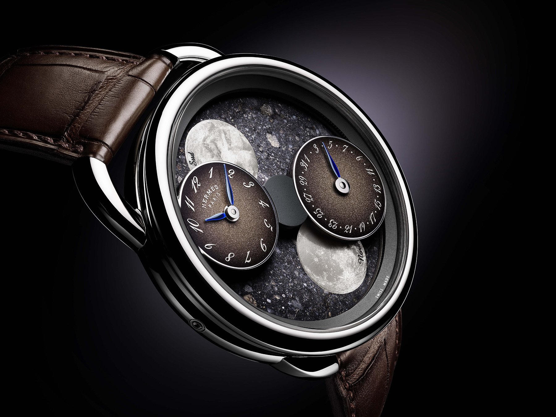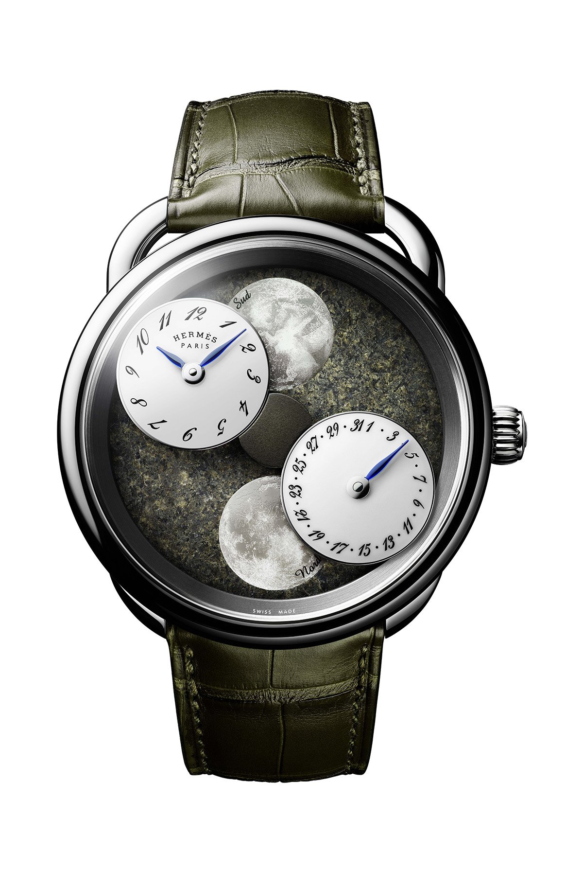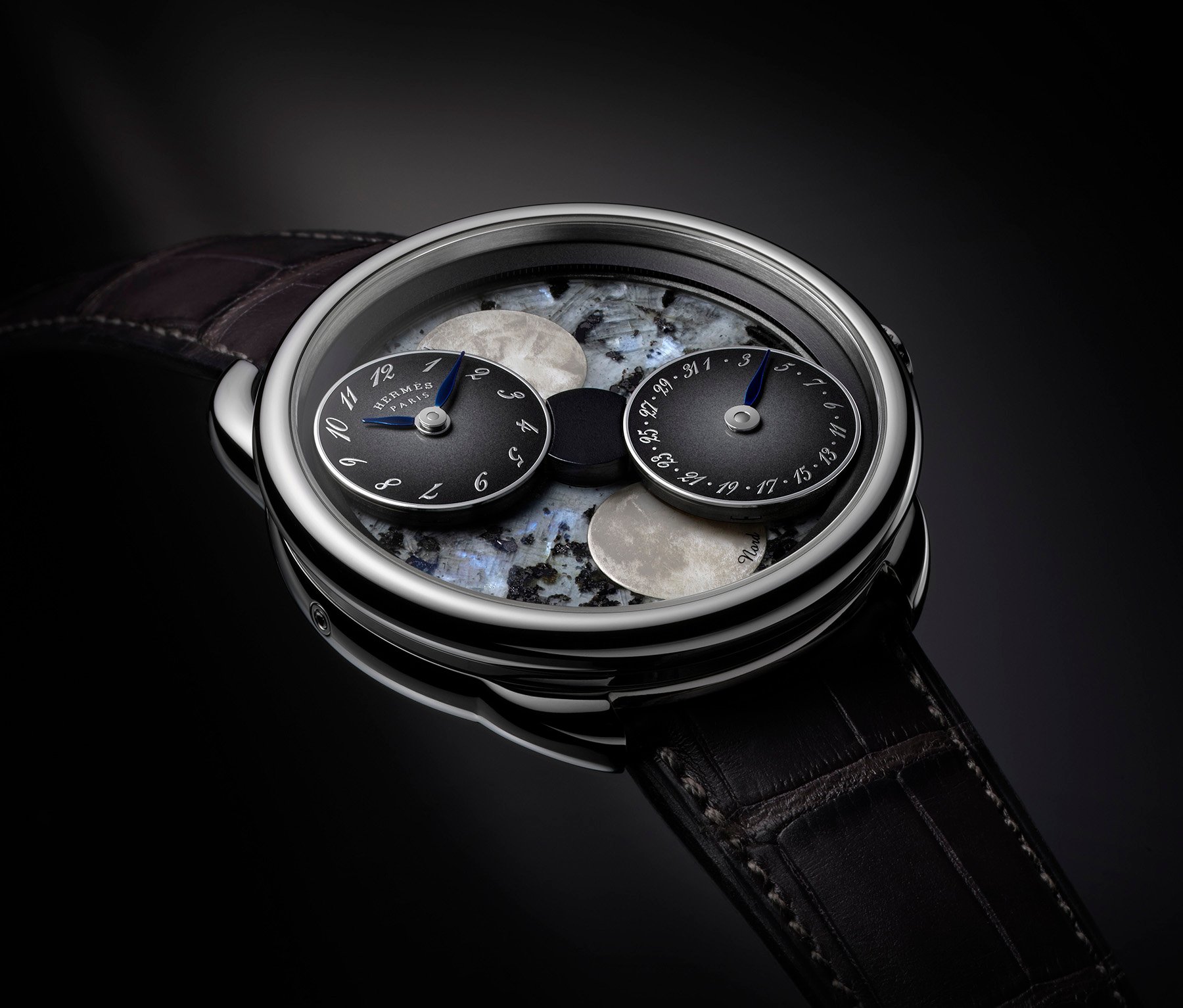 Out of all the new models, this is the closest to last year’s version with the gray meteorite dial. But Hermès has been clever by using silver color for the floating dials instead of the black dials of last year’s version. The overall effect is that this configuration puts a little more emphasis on the impact of the rotating dials, where last year’s version lets the two moons on the dial jump out.