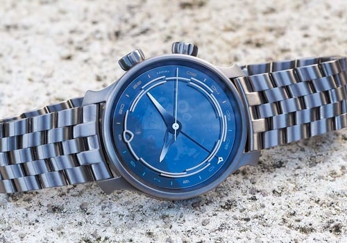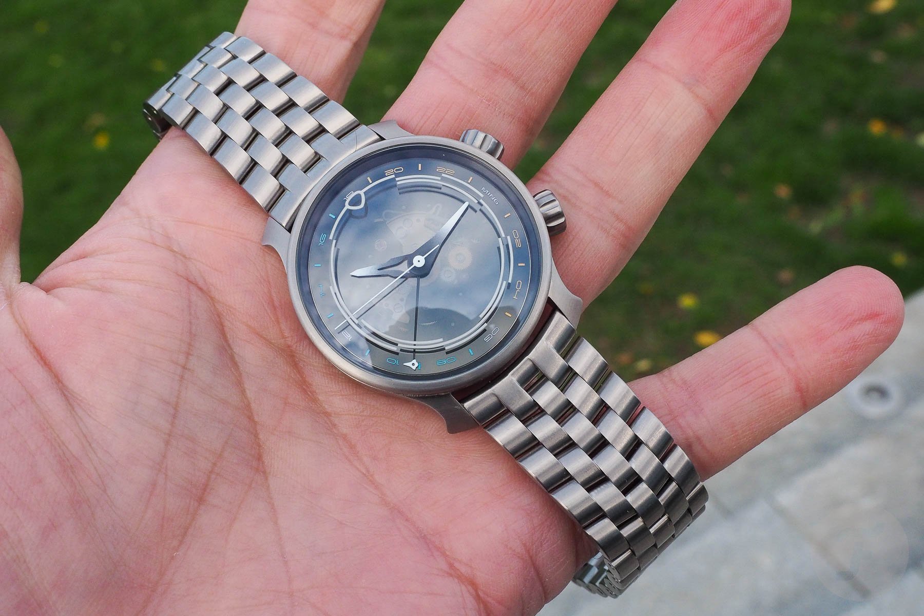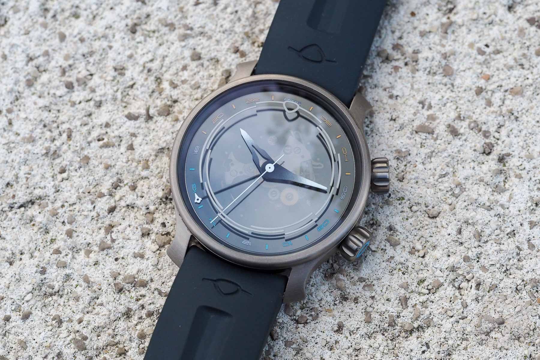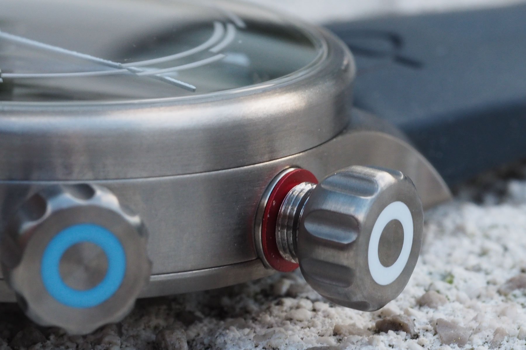 Despite its darker color, I sometimes find that titanium leaves me cold. Perhaps this is because many makers pair the cases with dark, monochromatic dials. The 37.11 Odyssey certainly isn’t whimsical, but the design manages to draw my eyes inward, thus making the watch feel less impersonal. That said, the technical material still offers plenty of precision. A good example of this is the upper time-setting crown. A red ring alerts the wearer that the crown is unscrewed, a helpful reminder before jumping into water. What struck me, though, was the precise, instrument-like nature of the crown threads and ring. It’s lovely and looks as if it could be on a watch from a much larger brand.