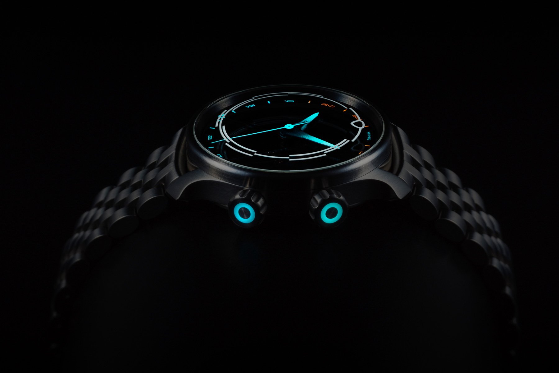 In their place is a set of luminous, gradient-coated hands that remind me of a space shuttle. This is especially true of the skeletonized outline on the hour hand. A white, needle-like seconds hand provides a delicate balance. Then, the 24-hour hand has a luminous spaceship on its end. Normally, this could sound kitschy, but it’s subtle and echoes the central hands’ design.