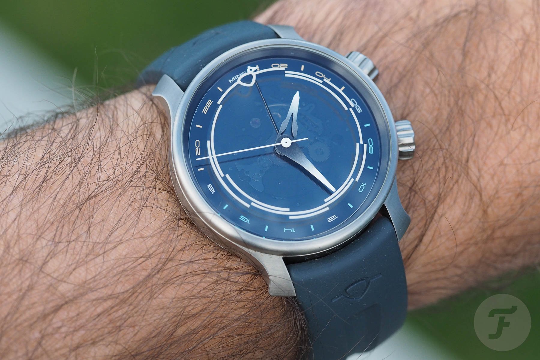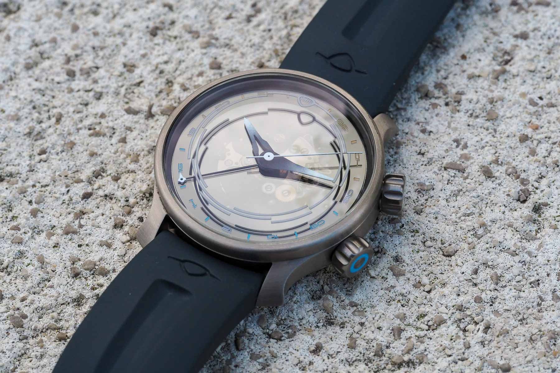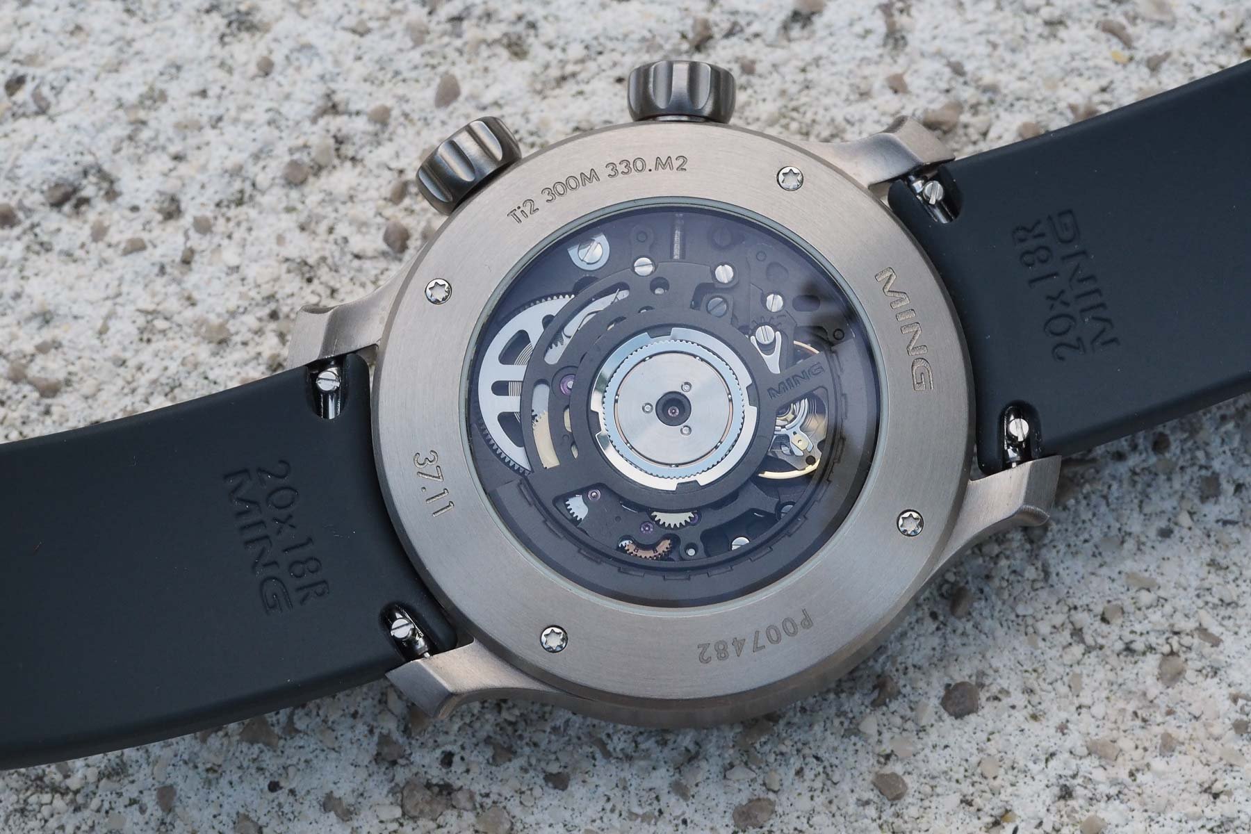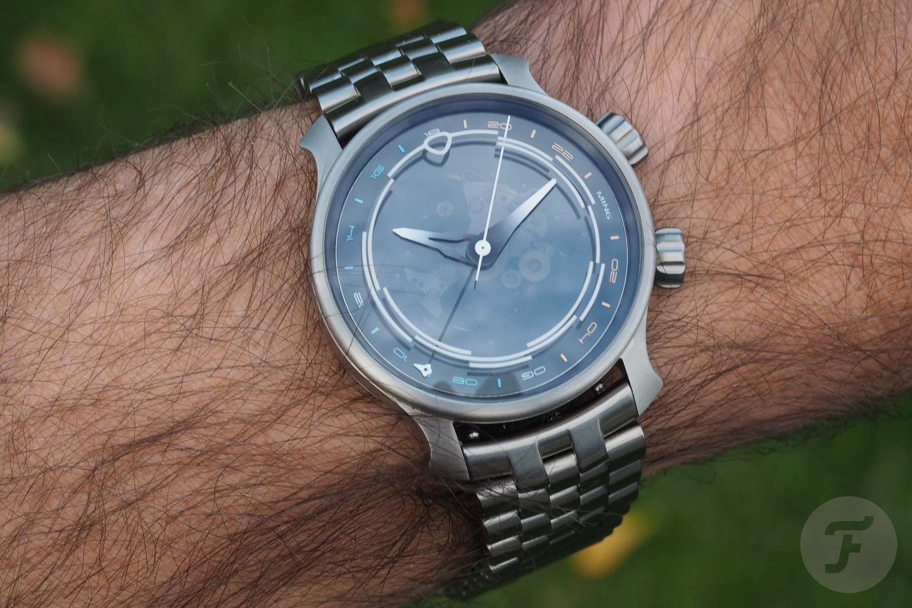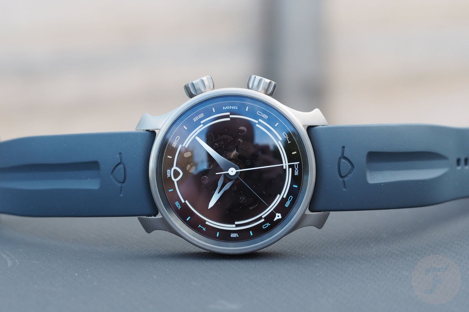 The watch I received came with the brand’s wonderful slate-gray FKM rubber strap and a matching titanium tuck buckle. I was also provided with the ultra-comfortable Universal Bracelet in Grade 2 titanium. Ming will offer both as options, while the stunning Grade 5 Polymesh will be the flagship choice. Openly, I spent 95% of the time with the watch on rubber because I loved the color and the comfort. England’s temperatures were ping-ponging between warm and cold with a mix of rain, so the rubber worked perfectly.