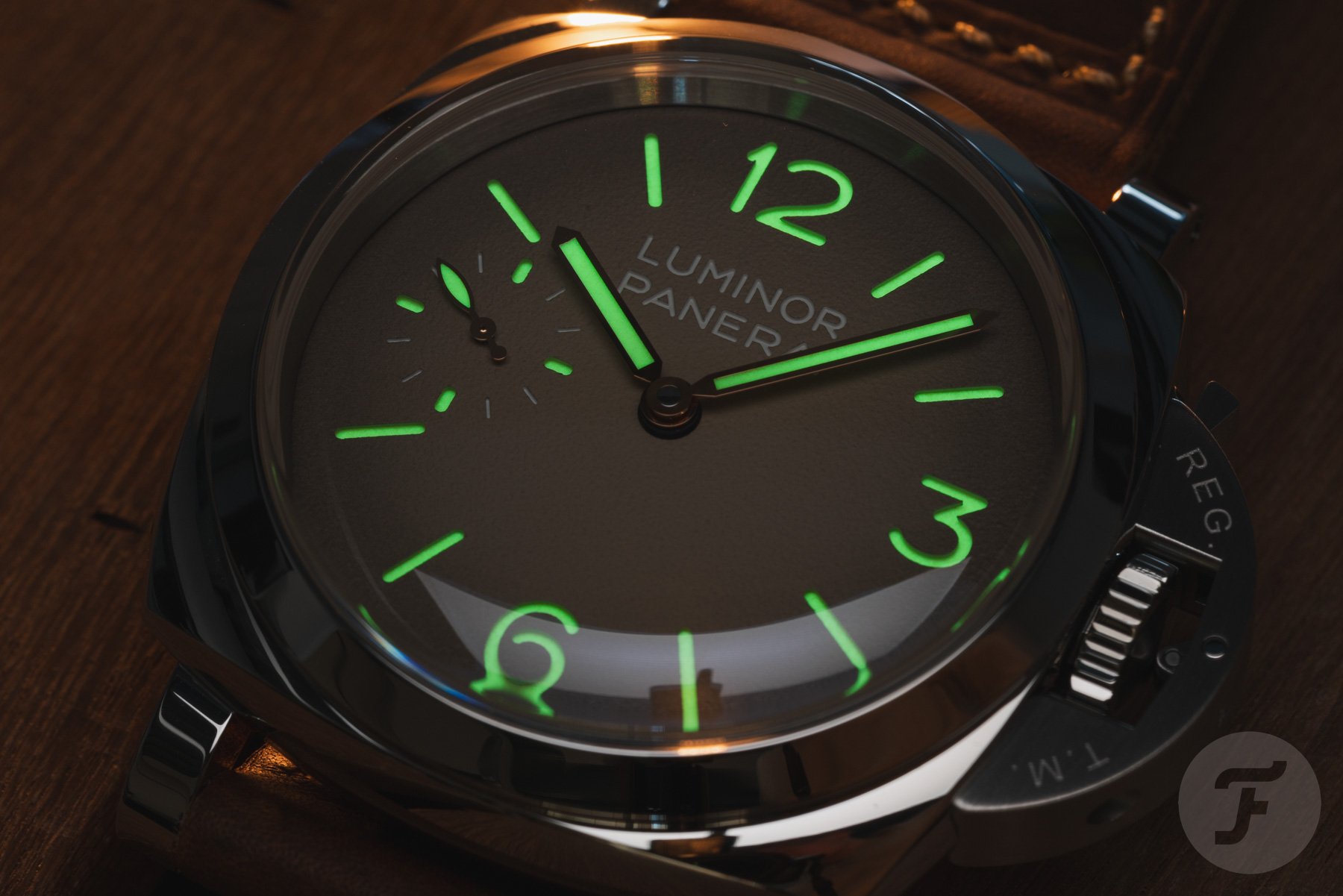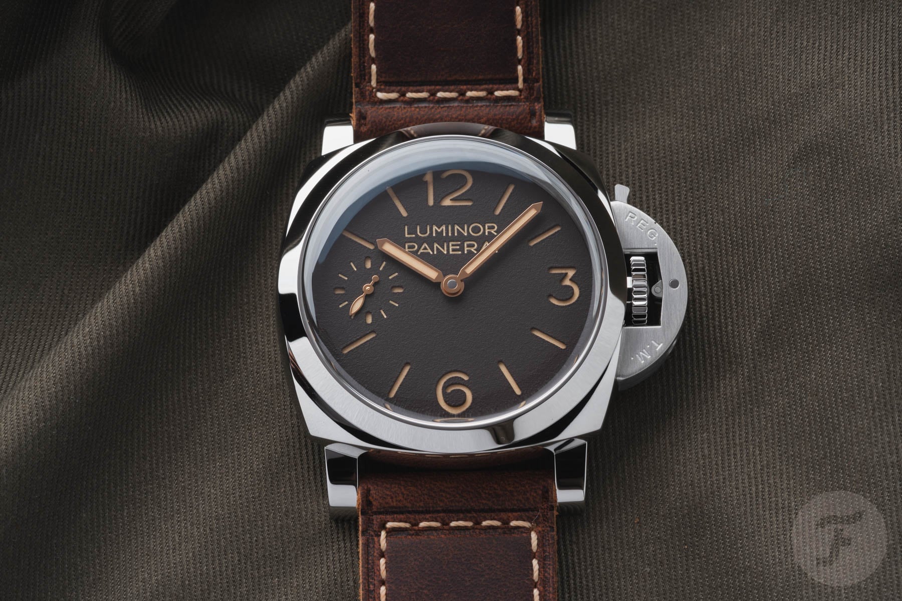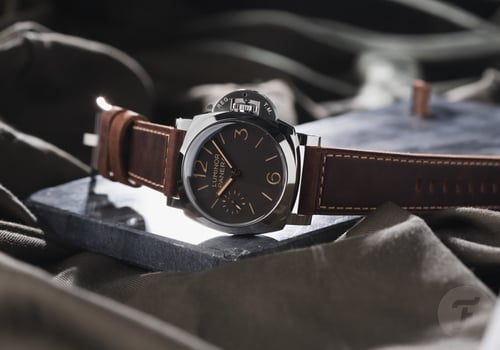 Finally, for those who enjoy a larger form, the Luminor PAM01735 may be the answer. This watch mimics the original vintage piece with its 47mm diameter and polished stainless steel case. Here, though, the aging is enhanced with a matte ivory sandwich dial and beige Super-LumiNova details. Perhaps the larger sapphire crystals on either side of the watch complicate the water resistance formula, as this piece has a 100m depth rating. Still, the watch comes on a dark brown calfskin strap with a black rubber strap also included.